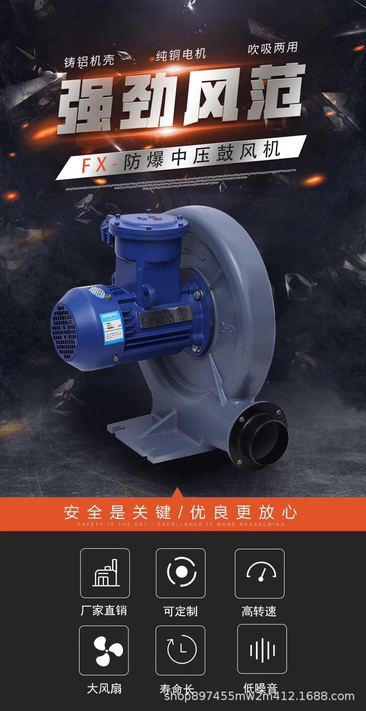 全风环保科技股份有限公司专业生产FX系列防爆中压鼓风机,产品采用高强度铸铝机身、F级绝缘防爆电机,具备吹吸双功能,适用于各种机械设备配套。风机具有风量大、噪音低、能耗低、耐腐蚀、不生锈等特点,广泛应用于石油化工、镁制品、制药、油漆、煤炭等有防爆要求的场所。 产品优势: - 整体铸铝制造,散热性能好,防火防腐蚀 - 防爆电机可选EX-DIIBT4/EX-DIICT4等级,防护等级IP55/IP56/IP65 - 进风口带过滤网,有效防止杂质进入,延长使用寿命 - 支持特殊电压、频率、耐高温及防腐处理定制 - 提供OEM/ODM服务,支持工程师售后与特殊配送 公司已通过3C、CE认证,拥有中国国家强制性产品认证证书,确保产品质量与安全。现货库存充足,工厂直销,按时发货,提供完善的售后服务体系。