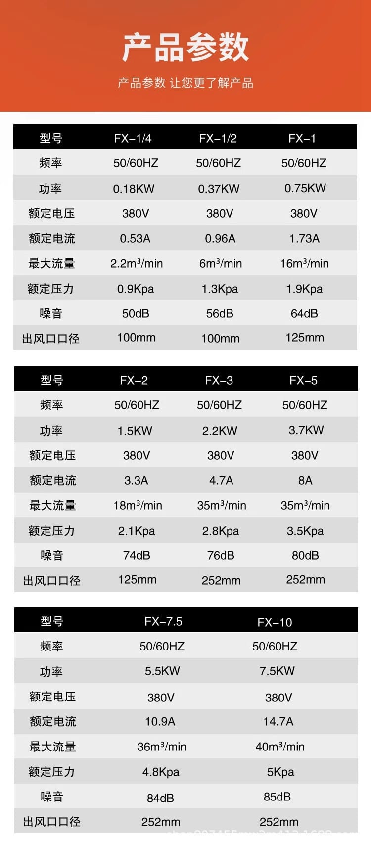 全风环保科技股份有限公司专业生产FX系列防爆中压鼓风机,产品广泛应用于石油化工、镁制品厂、油漆厂、制药厂、煤炭厂等对安全性要求高的场所。风机采用整体铸铝制造,机身加厚,散热性能好,防火防腐蚀,不生锈,确保长期稳定运行。 本系列风机配备防爆高效电机,防爆等级可选EX-DIIBT4或EX-DIICT4,绝缘等级F级,防护等级可达IP55/IP56/IP65,安全可靠。电机为纯铜绕组,动力强劲,能耗低,配合高强度叶轮设计,实现大风量、高压力输出,同时保持低噪音运行。 产品具有吹吸双功能,适用于多种机械设备配套,进出风口经过优化设计,进风口配有过滤网,有效防止杂质进入,保持内部清洁。支持特殊模具定制、非标电压频率、OEM/ODM合作,并提供工程师售后服务与增值开票服务。 型号覆盖FX-1/4至FX-10,功率范围0.18KW-7.5KW,最大流量达40m³/min,出风口口径100mm-252mm,满足不同工况需求。工厂直销,库存充足,发货及时,提供3C、CE认证及专利证书,品质有保障。