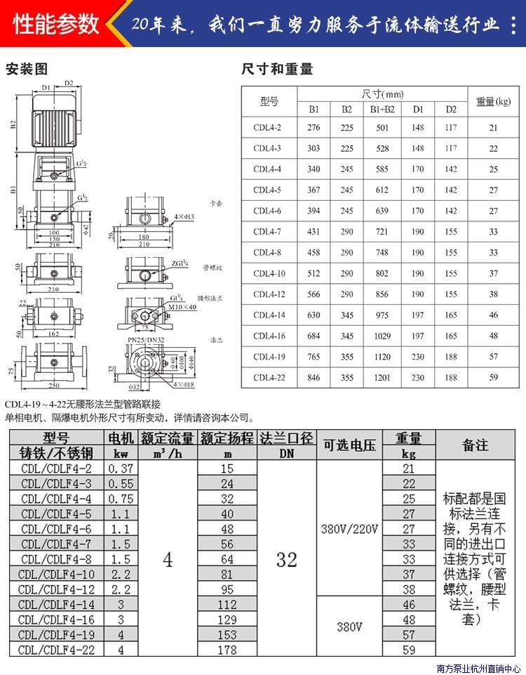 〉 杭州南泵CDL/CDLF4-2/3/4/5/6/7/8/10/12立式多级增压泵循环泵