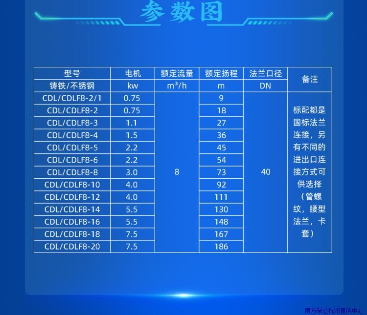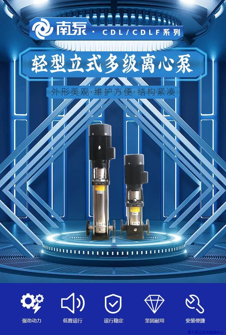 南方泵业CDL/CDLF系列轻型立式多级离心泵,外形美观、结构紧凑、维护方便,适用于从自来水到工业液体的多种介质输送。其中,CDL系列适用于无腐蚀性液体,CDLF系列适用于轻度腐蚀性液体,具有节能、低噪音、经久耐用、环保和运行稳定等优点。 该系列产品广泛应用于: - 供水系统:水厂输送、高层建筑二次供水、分区送水; - 工业增压:清洗系统、高压冲洗、流程水系统; - 液体运输:冷却水、锅炉给水、机床配套、酸碱溶液; - 农业灌溉:喷灌、滴灌系统; - 水处理:反渗透、超滤、游泳池循环系统等。 运行条件: - 液体类型:稀薄、干净、非易燃易爆,不含固体颗粒或纤维; - 液体温度:-15℃ 至 120℃(热水型); - 环境温度:最高+40℃; - 海拔:≤1000米; - 电机标准:IP55防护等级,F级绝缘,全封闭风冷式二级电机。 产品优势: - 坚固耐用,安装便捷; - 多种法兰连接方式可选(管螺纹、腰形法兰、卡套等); - 支持全国联保,一年质保服务,专业客服全程支持; - 杭州直销中心发货,闪电发货,售后无忧。 选择南方泵业,品质保障,服务领先,是您在水处理与流体输送领域的可靠合作伙伴。