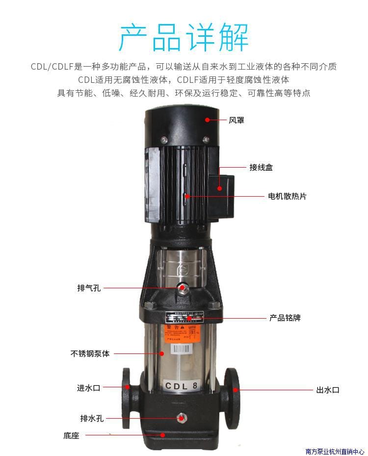 南方泵业CDL/CDLF系列多级离心泵是一款高性能、多功能的流体输送设备,广泛应用于从自来水到工业液体的各种介质输送。CDL系列适用于无腐蚀性液体,CDLF系列则适用于轻度腐蚀性液体,具有节能、低噪、经久耐用、环保及运行稳定等优点。 该系列产品采用不锈钢泵体,结构紧凑,维护方便,外形美观。电机为全封闭风冷式二级标准电机,防护等级IP55,绝缘等级F级,确保在复杂工况下稳定运行。适用介质温度范围广,常温型可达-15℃至70℃,热水型可达-15℃至120℃,环境温度最高+40℃,适用于海拔1000米以下场所。 应用领域包括:高层建筑二次供水、水厂过滤与输送、工业流程增压、冷却系统、锅炉给水、农田灌溉、喷灌滴灌、游泳池循环、反渗透与超滤系统等。 产品标配国标法兰连接,电压可选单相或三相多种规格,满足不同地区用电需求。提供一年质保、配件齐全、全国联保及终身售后服务,订单当天发货,物流覆盖全国(偏远地区补运费),专业客服全程技术支持。 选择南方泵业杭州直销中心,品质保障,服务无忧。