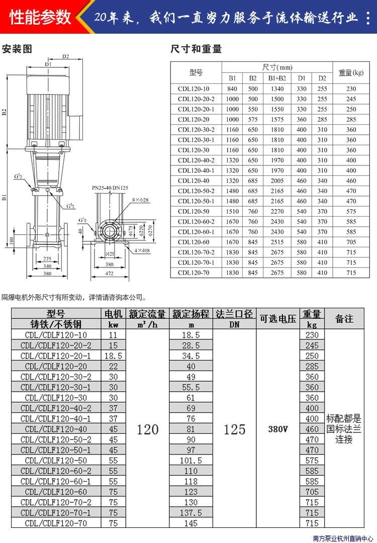 杭州南泵增压循环泵CDL/CDLF120-50-60/70FSWSC立式多级离心
