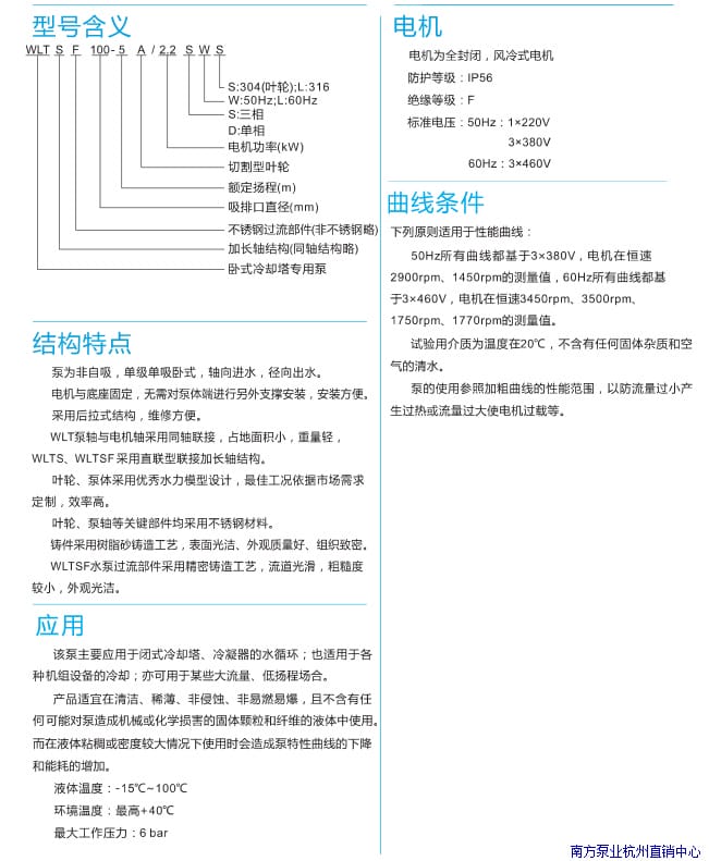南方泵业WLT系列卧式冷却塔专用泵为非自吸、单级单吸卧式离心泵,采用轴向进水、径向出水设计,结构紧凑,安装维修方便。产品分为WLT、WLTS和WLTSF三种型号,其中WLTSF过流部件采用精密铸造不锈钢(AISI304),耐腐蚀性强,适用于清洁、稀薄、非侵蚀性液体环境。泵体与电机同轴连接,运行稳定,占地面积小;叶轮、泵轴等关键部件均采用不锈钢材料,确保长期可靠运行。广泛应用于闭式冷却塔、冷凝器水循环系统以及各类机组设备冷却场合。液体适用温度范围-15℃~100℃,最大工作压力6bar,电机防护等级IP56,绝缘等级F级。提供多种功率与扬程配置,满足不同工况需求,是高效节能的理想水泵选择。