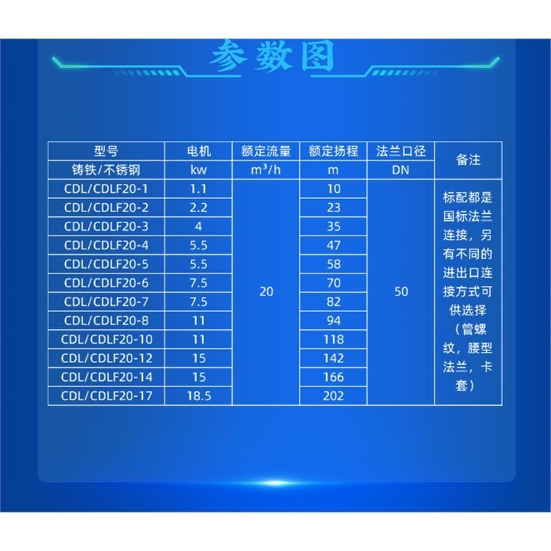 南方泵业CDL/CDLF系列轻型立式多级离心泵,外形美观、结构紧凑、维护方便,广泛应用于从自来水到工业液体的各种介质输送。CDL适用于无腐蚀性液体,CDLF适用于轻度腐蚀性液体,具备节能、低噪音、运行稳定、经久耐用等优点。 该系列产品采用全封闭风冷式二级电机,防护等级IP55,绝缘等级F,适应多种电压标准,运行可靠。适用介质为稀薄、干净、非易燃易爆且不含固体颗粒或纤维的液体,工作温度范围广,环境适应性强。 应用领域包括:高层建筑二次供水、水厂输送、工业流程增压、冷却系统、锅炉给水、反渗透与超滤水处理系统、农田喷灌滴灌等。 主要型号涵盖CDL20-1至CDL20-17,流量可达20m³/h,扬程最高达202米,标配国标法兰连接,支持管螺纹、卡套等多种接口方式。支持闪电发货,全国联保,一年质保,专业客服全程技术支持,确保用户使用无忧。