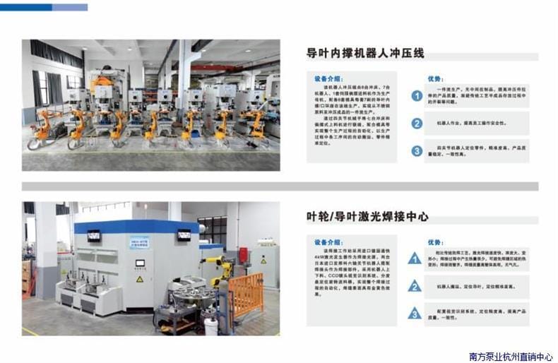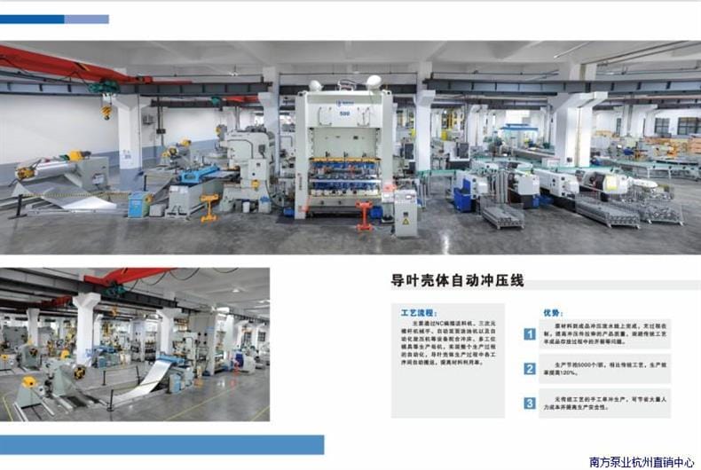 浙江南泵流体机械有限公司是一家集研发、生产、销售于一体的高新技术企业,专注于流体机械领域。公司总投资3亿元,被列入浙江省重大产业项目,拥有现代化生产基地,一期工厂占地70亩,建筑面积达8.2万平方米,二期工厂预计于2023年6月开工建设。 公司主要生产不锈钢冲压焊接多级离心泵、污水泵、海水淡化设备等多种系列产品,广泛应用于增压、工业、水处理、楼宇供水、空调水循环、消防系统、污水处理、化工行业及市政用水等多个领域。 凭借先进的自动化生产线,包括级进模冲压、AGV物流运输、机器人焊接、激光焊接中心、立体成品库及装配测试一体化自动线,确保产品高精度、高质量和高效率生产。公司已在全国建立完善的销售与服务体系,在各大城市设有办事处和技术服务中心,为客户提供及时、便捷的服务支持。 主打产品CDL(F)系列多级离心泵涵盖DN25至DN65多种规格,流量扬程覆盖广泛,功率从0.55kW至18.5kW,扬程最高可达205米,满足不同工况需求。产品以高效节能、运行稳定、耐腐蚀性强著称,是工业与民用领域理想的流体输送解决方案。