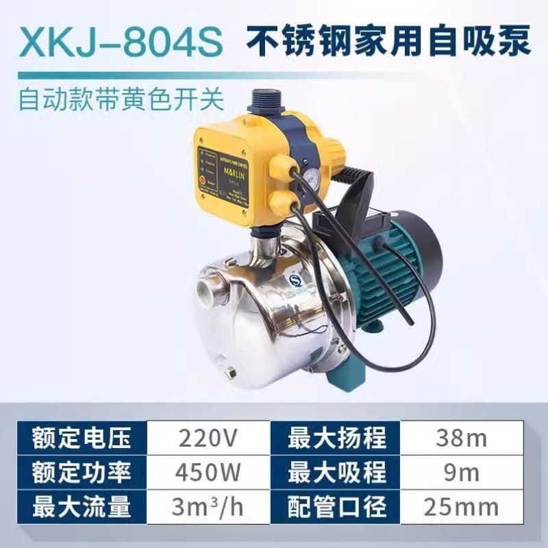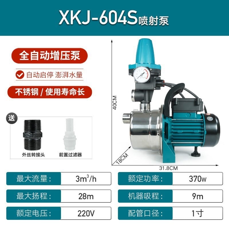 XKJ系列全自动不锈钢喷射泵,采用高品质不锈钢材质,具备自动启停功能,实现高效节能与持久耐用。系列产品包括XKJ-1104S、XKJ-904S、XKJ-804S和XKJ-604S,满足不同流量与扬程需求。其中XKJ-1104S最大流量达42m³/h,最大扬程46m,额定功率750W;其余型号流量均为3m³/h,扬程范围28-42m,功率覆盖370W至550W,均配备1寸配管口径、前置过滤器及外丝转接头,安装便捷。设备支持220V电压,机器吸程可达9米,适用于家庭供水、小型工业系统等多种场景,确保稳定增压与长久运行。