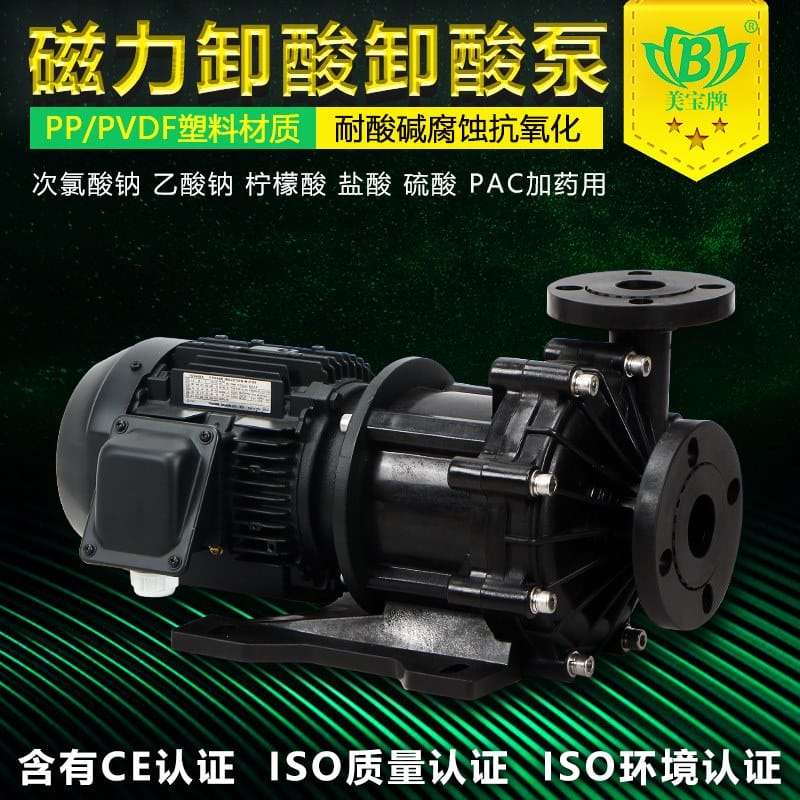 美宝环保设备有限公司是中國耐酸鹼泵浦行業領導者,自主研發生產美寶牌系列防腐泵。公司擁有占地85000m²的現代化生產基地,配備注塑、加工、測試、組裝等全產業鏈車間,確保產品品質穩定可靠。 美寶牌耐腐蝕磁力驅動泵採用PP或PVDF材質一體成型,無焊接點,徹底杜絕泄漏風險。核心部件使用稀土钕鐵硼與釤鈷強磁鐵,磁力持久不退;葉輪與內磁一體成型,提升耐磨性與運行效率。标配東元、東芝等品牌電機,可選銅芯電機及過載保護裝置,適應多種工業環境。 產品廣泛應用於酸鹼液輸送、加藥、卸料等領域,具備高效、耐高溫、耐腐蝕、無氣泡等優勢。所有泵均享受兩年質保、終身維護服務,並提供正規增值稅發票。全國設有12家售後服務網點,支持快速響應與技術支持。 型號涵蓋MSH-F-250至MSH-F-655,口徑從25mm到65mm,功率0.5KW至3.75KW,滿足不同流量與揚程需求。安裝靈活,配備活動式法蘭,便於現場調節。美寶環保持有ISO質量/環境認證、CE認證及多項專利證書,誠信經營,值得信賴。 選擇美宝,就是選擇安心與專業——防腐泵·找美宝!