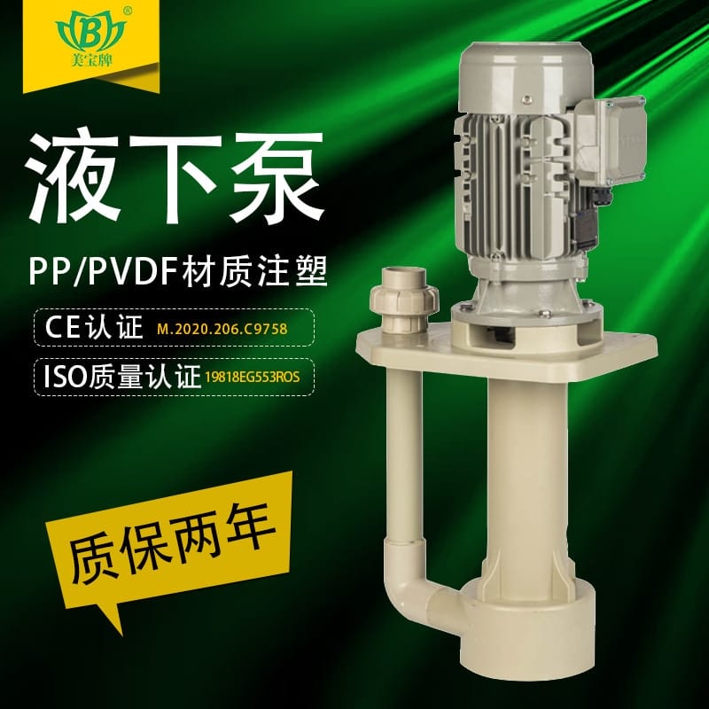 美宝牌MIT系列PP塑料液下泵,专为输送腐蚀性化学液体设计,采用FRPP、PVDF等耐腐蚀材质,具备可空转、干式液封、无水空转不损坏等优势,适用于酸碱液体循环、电镀废水提升、废气塔喷淋系统、涂装前处理等多种工业场景。产品标配全流量调节性能,出口口径涵盖50*40mm至65*50mm,马力从2HP到5HP可选,扬程最高可达31米,流量达420L/min。所有泵均自主生产,提供两年质保、终身维护,并支持根据介质比重(VK/VP)及工况需求定制。美宝环保拥有85000m²生产基地和12家售后服务网点,通过ISO9001质量体系、CE认证及多项专利认证,确保产品质量稳定可靠。购买即附合格证、说明书、质保卡、正规增值税发票,全国发货,售后无忧。