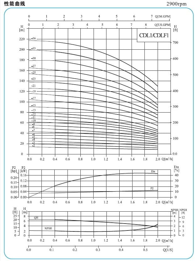 4、泵的使用参照加粗曲线的性能范围,以防流量过小产生过热和流量过大使电机过载等。