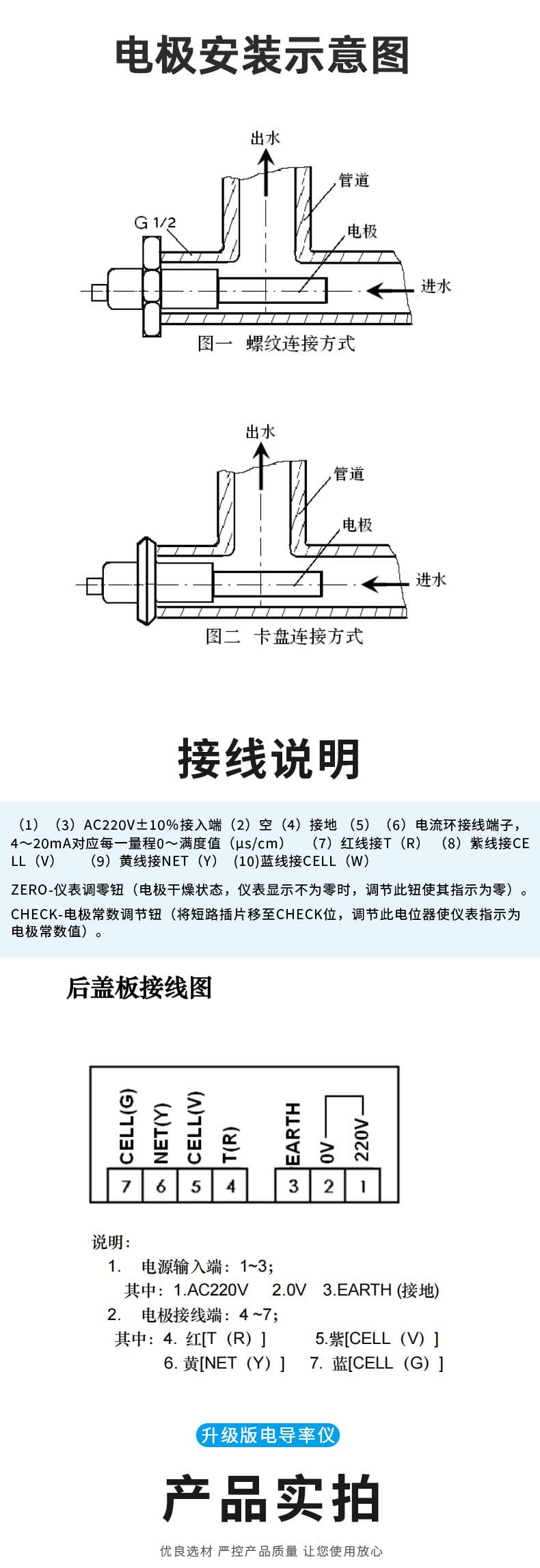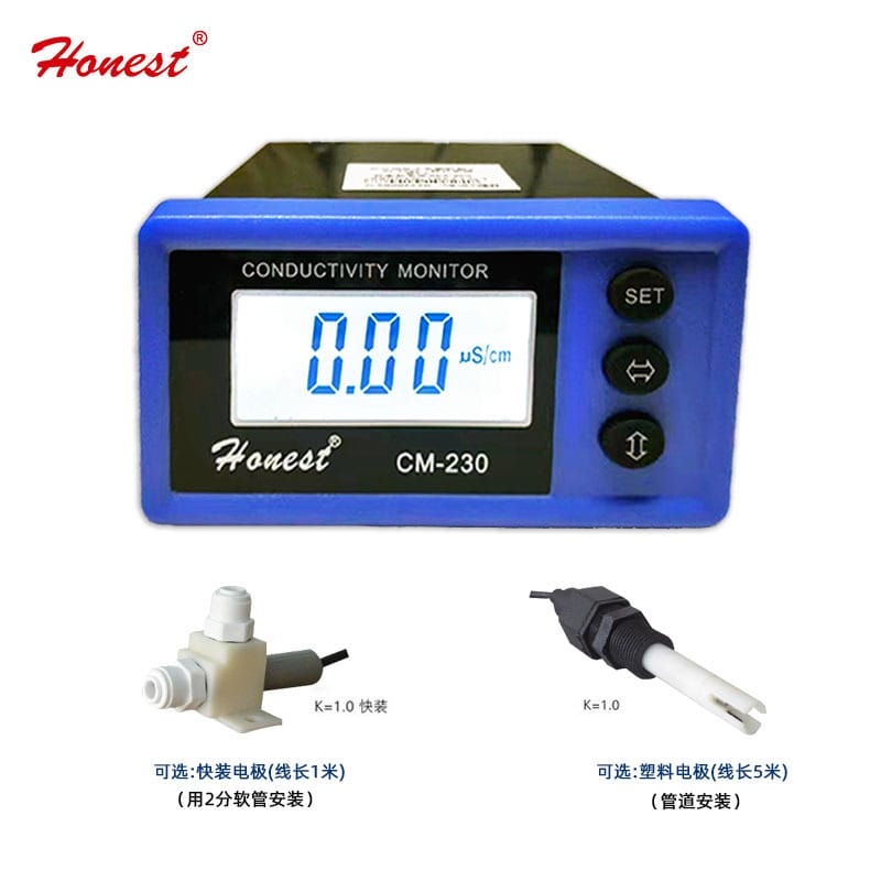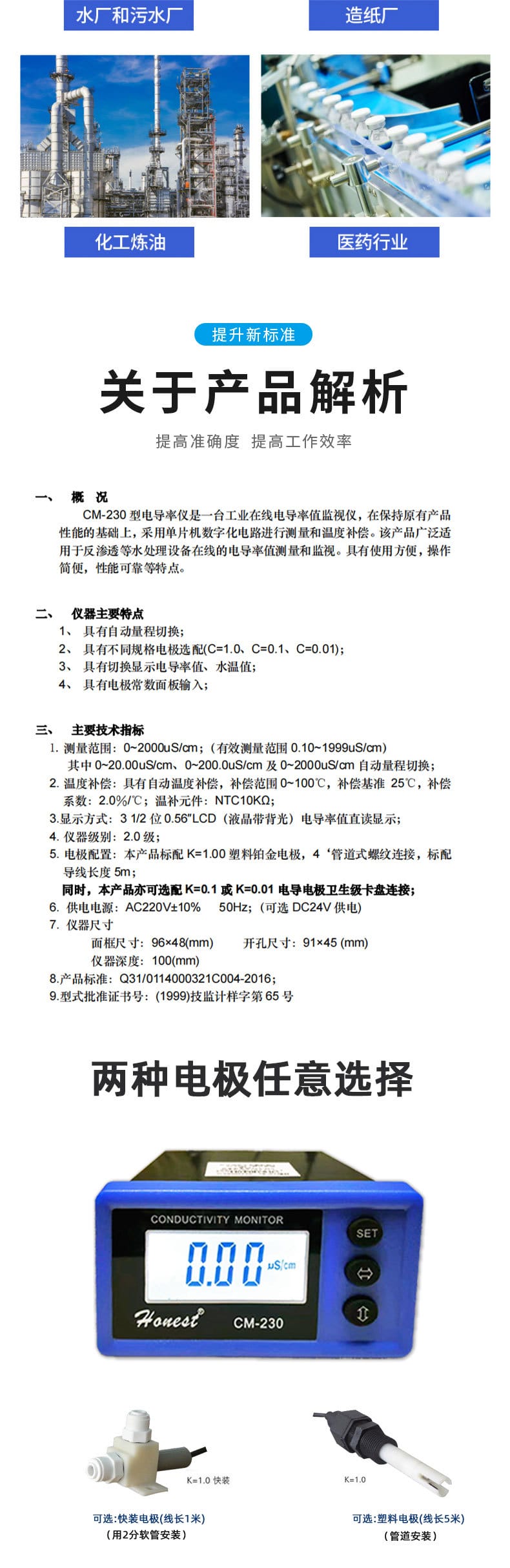 阔思CM-230系列工业在线电导率仪是一款专为反渗透水处理、纯水检测、污水处理及工业过程溶液监测设计的高可靠性仪表。采用单片机数字化电路实现精确测量与自动温度补偿(NTC10KΩ,2.0%/℃),测量范围0~2000μS/cm,支持0.10~1999μS/cm有效范围自动量程切换,确保数据稳定准确。 仪器标配K=1.0塑料铂金电极(5米线长,4'螺纹连接),可选配K=0.1或K=0.01卫生级快装卡盘电极,满足不同应用场景需求。支持电导率值与水温值切换显示,用户可面板输入电极常数,并配备调零与校准功能,提升测量便捷性与准确性。 产品具备4~20mA电流环输出,支持远传信号接入控制系统,适用于石油、化工、冶金、造纸、医药及水厂/污水厂等工业领域。LCD背光液晶屏清晰显示,操作简单,维护方便。供电方式支持AC220V或DC24V,适应多种现场环境。 升级版CM-230H新增自动调零、自动量程等功能,相比老款使用更便捷、运行更稳定,全面助力工业水质监控效率提升。