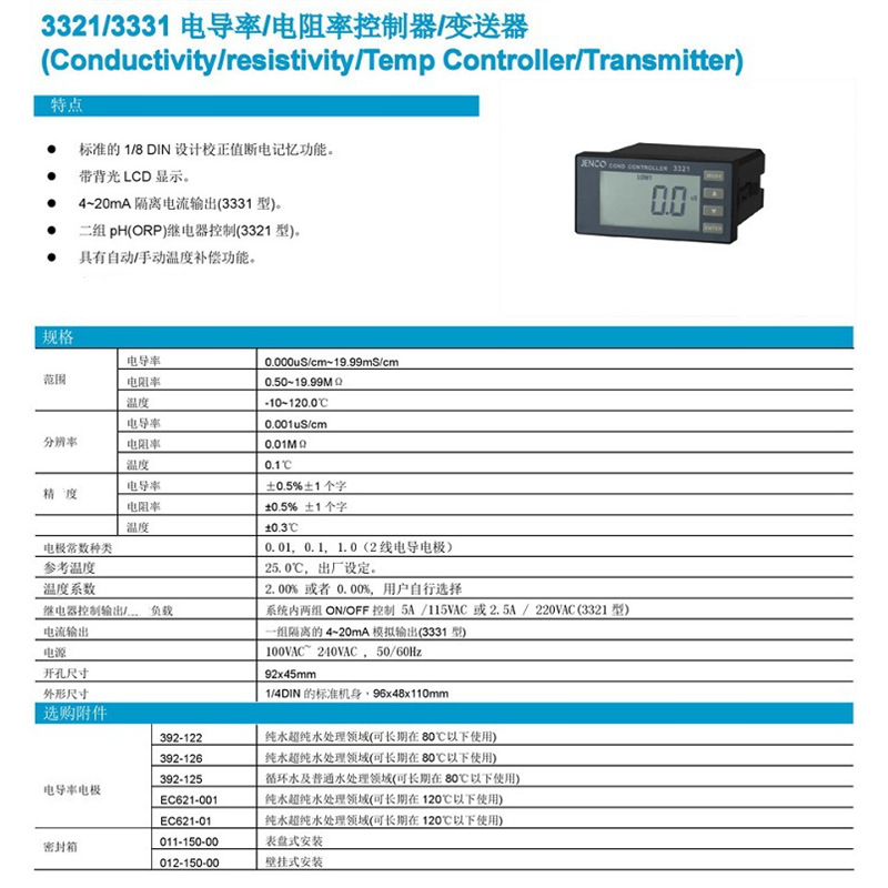 本产品为导电度、笔电阻、温度合一控制器,1/8DIN,具2个可编程之开闭继电器与背光功能。