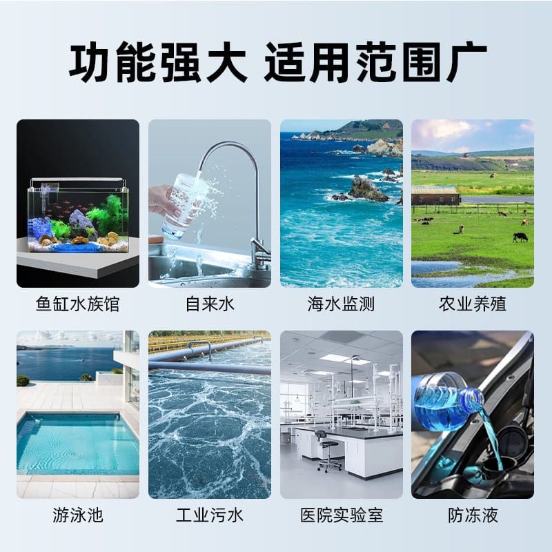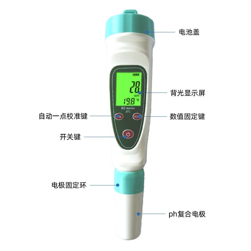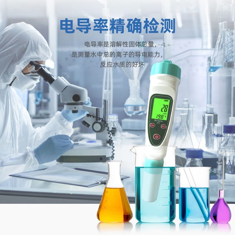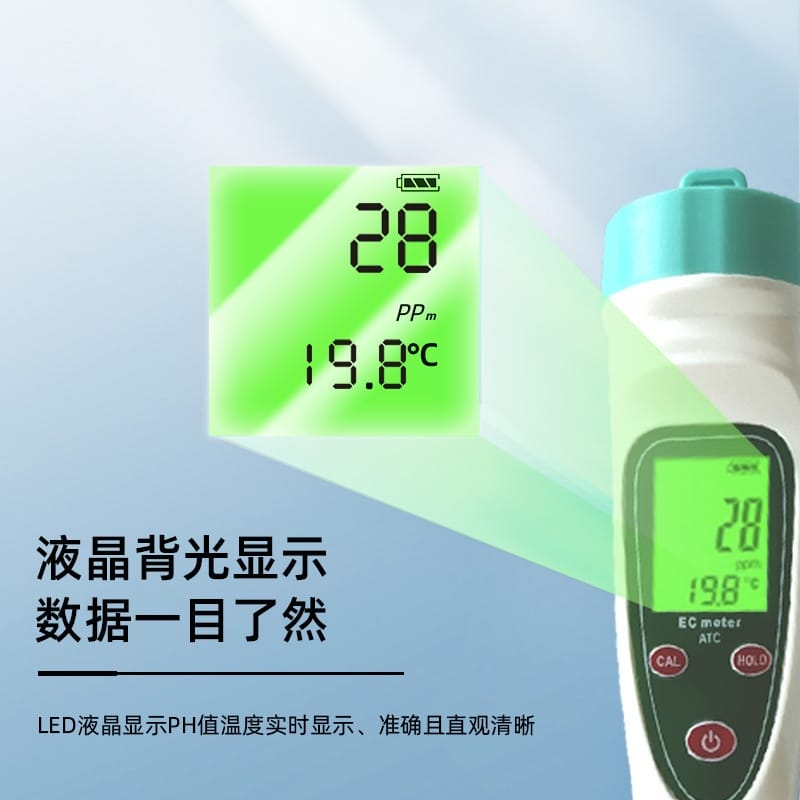 凯米斯LEC-101笔式电导率仪是一款专为家庭及多种场景设计的水质检测工具,可准确测量水中的电导率(EC)和溶解性总固体(TDS),帮助用户全面了解水质状况。产品广泛应用于直饮水检测、净水器效果评估、水族馆水质管理、无土栽培、农业养殖、游泳池维护及科学实验等领域。 采用高精度传感器,测量范围0-2000μS/cm,分辨率达1μS/cm,配合自动温度补偿(ATC)功能,确保在不同环境温度下测量结果稳定可靠。配备LCD背光大屏,支持电导率与温度双显示,读数清晰,绿色亮屏更护眼。人体工学设计,握感舒适,按键寿命高达上万次,经久耐用。 支持一键校准(CAL)、数据锁定(HOLD)和单位切换(℃/℉),操作简单便捷。电极头与电池均可更换,延长仪器使用寿命。标配缓冲液套装,方便定期校准,保证测量准确性。适用于各类水质污染监测场景,有效防范因管道老化、水箱污染或工业排放带来的健康风险。 产品符合国家饮用水电导率标准参考值,助力用户判断水质优劣,守护家人饮水健康。整机质保一年,使用安全环保,是家庭与专业场合理想的水质检测解决方案。