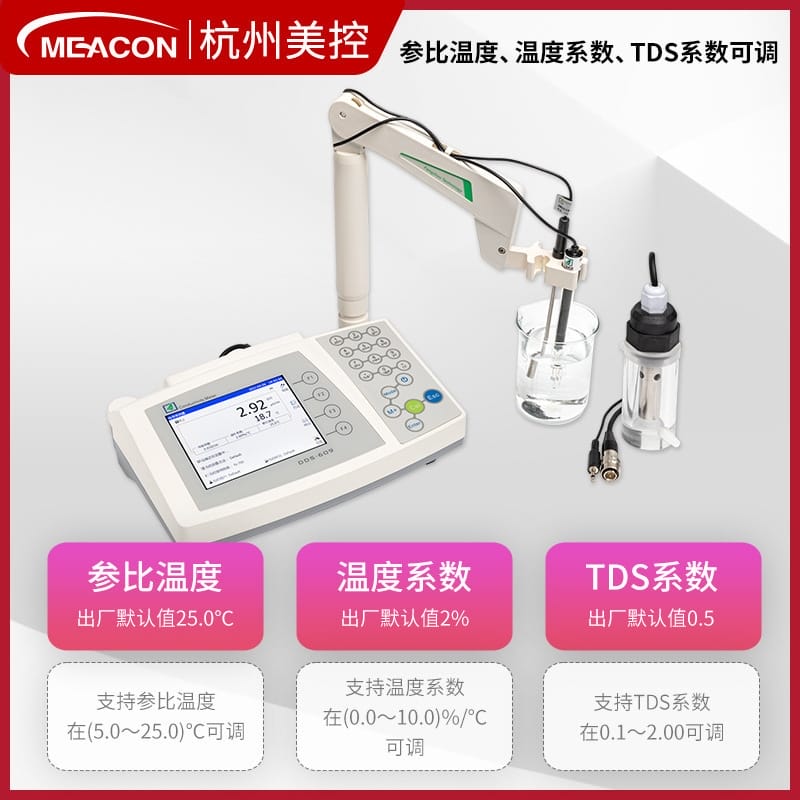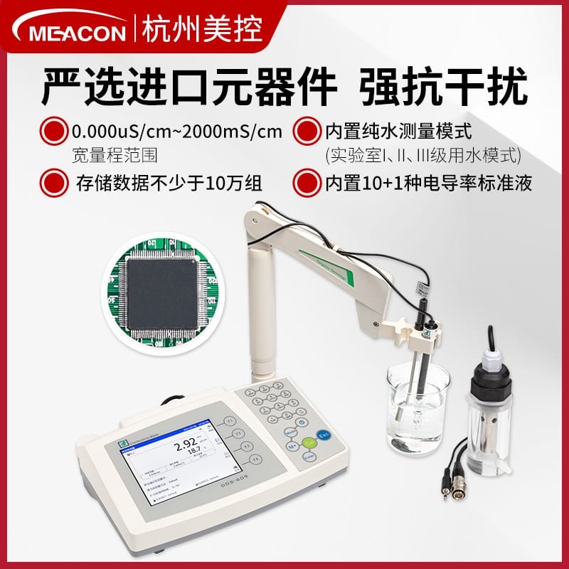 MEACON(杭州美控)电导率/电阻率/TDS/盐度/电导灰分/温度多功能水质分析仪,涵盖DDS-609、DDS-608、DDS-302+、DDS-11A、DDS-200、DDS-307+、DDS-307、DDS-309+等系列产品,广泛应用于化工、化妆品、食品、生物、农业、污水、纯水及强酸强碱等复杂工况。产品具备0.5级高精度,量程宽至0.000μS/cm~2000mS/cm,支持自动量程切换、智能温度补偿、多系数可调(参比温度、温度系数、TDS系数),内置10+1种用水模式(含实验室Ⅰ/Ⅱ/Ⅲ级、制药纯水、注射用水、电子级用水等),并带报警提示功能。采用进口元器件与全自动SMT贴片产线,确保测量稳定性提升20倍。配备大屏LCD显示,支持GLP数据管理,存储容量超10万组。作为国家标准起草单位与‘专精特新’企业,MEACON拥有近百项专利技术,通过ISO、CE、SGS等多项权威认证,致力于为工业自动化提供高可靠性水质监测解决方案。