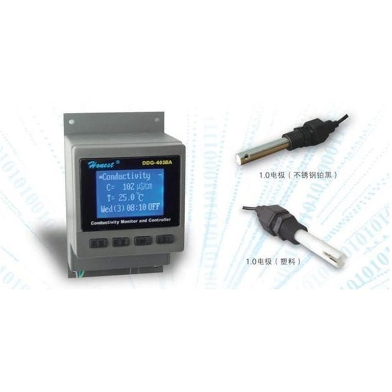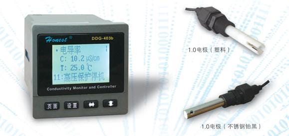 DDG-403b型智能型电导率测量控制仪是一台电导率在线测量监控及水处理设备自动运行可编程序控制兼容的测量控制仪。采用MCU技术进行测量,温度补偿及全自动运行控制,并配有RS-232C标准串口通信接口输出,可同我公司DY-301B型打印机进行通讯连接,实现测量数据的实时打印记录。是工业水处理设备实现电导率测量和自动化控制融合的新一代智能型产品,本产品具有使用方便、性能可靠、显示直观、控制方法灵活等特点。