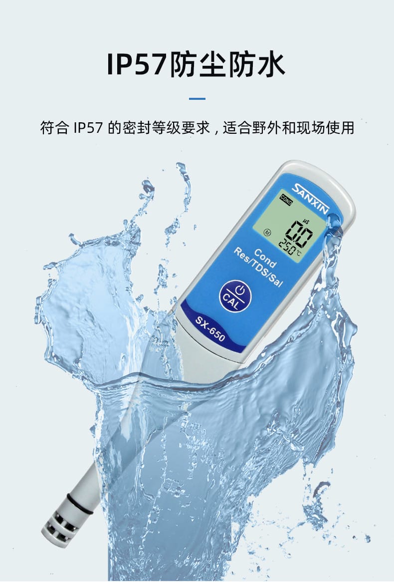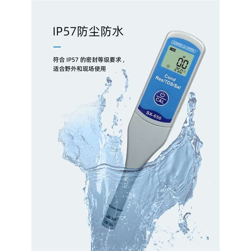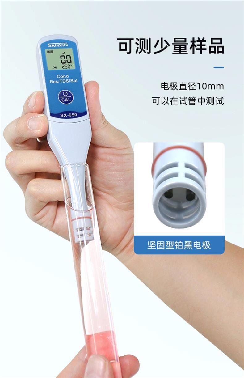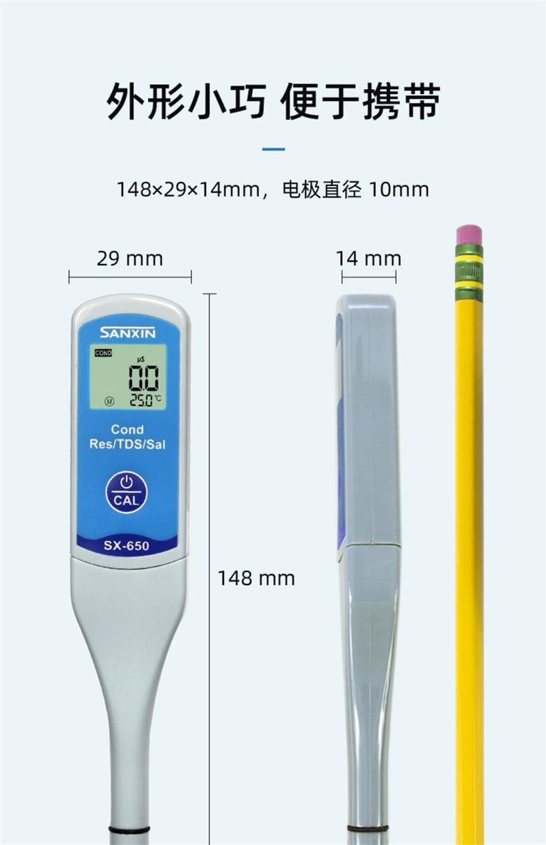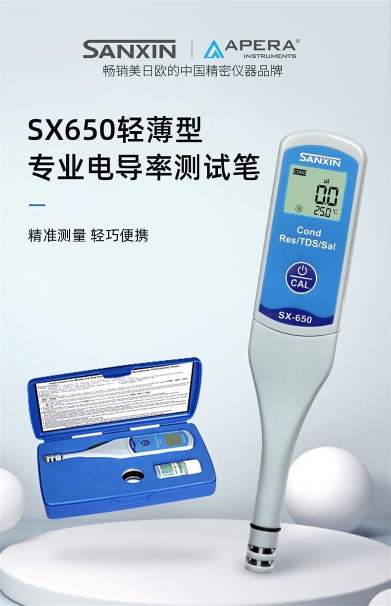 SANXIN SX650轻薄型专业电导率测试笔由上海三信沛瑞仪器科技有限公司(SANXIN APERA)研发生产,是一款集电导率、电阻率、TDS、盐度和温度测量于一体的便携式水质分析工具。产品采用智能芯片设计,支持1点自动校准和0~50℃自动温度补偿,确保测量精准可靠。机身尺寸仅为148×29×14mm,重量仅38g,便于随身携带,适合现场及野外使用。 SX650配备坚固的铂黑电极,电极直径为10mm,可在试管等小容量容器中直接测试,操作简便,仅需一个按键即可完成开关机、模式切换与校准。支持COND、RES、TDS、SAL四种测量模式循环切换,并具备IP57级防尘防水性能,适应多种复杂环境。 技术参数: - 电导率测量范围:0~50.0μS/cm 至 5.0~50.0mS/cm - 电阻率:0~20.0MΩ·cm - TDS:0~35.0g/L - 盐度:0~25.0ppt - 温度范围:0~50.0℃ - 精度:电导率±1.0%FS,温度±0.5℃ - 电源:CR2032锂电池×2,连续使用超100小时 应用领域包括教育科研、环境监测、饮品质量控制、水处理、水产养殖、水培、游泳池与温泉管理等。每台仪器出厂前均已校准,附带1413μS/cm校准液、浸泡液、说明书及专用口袋手提盒,开箱即用。 本产品享受2年质保服务,支持7天无理由退换货,提供13%增值税专用发票。三信专注电化学水质分析30年,产品远销欧美日等50多个国家,品质值得信赖。