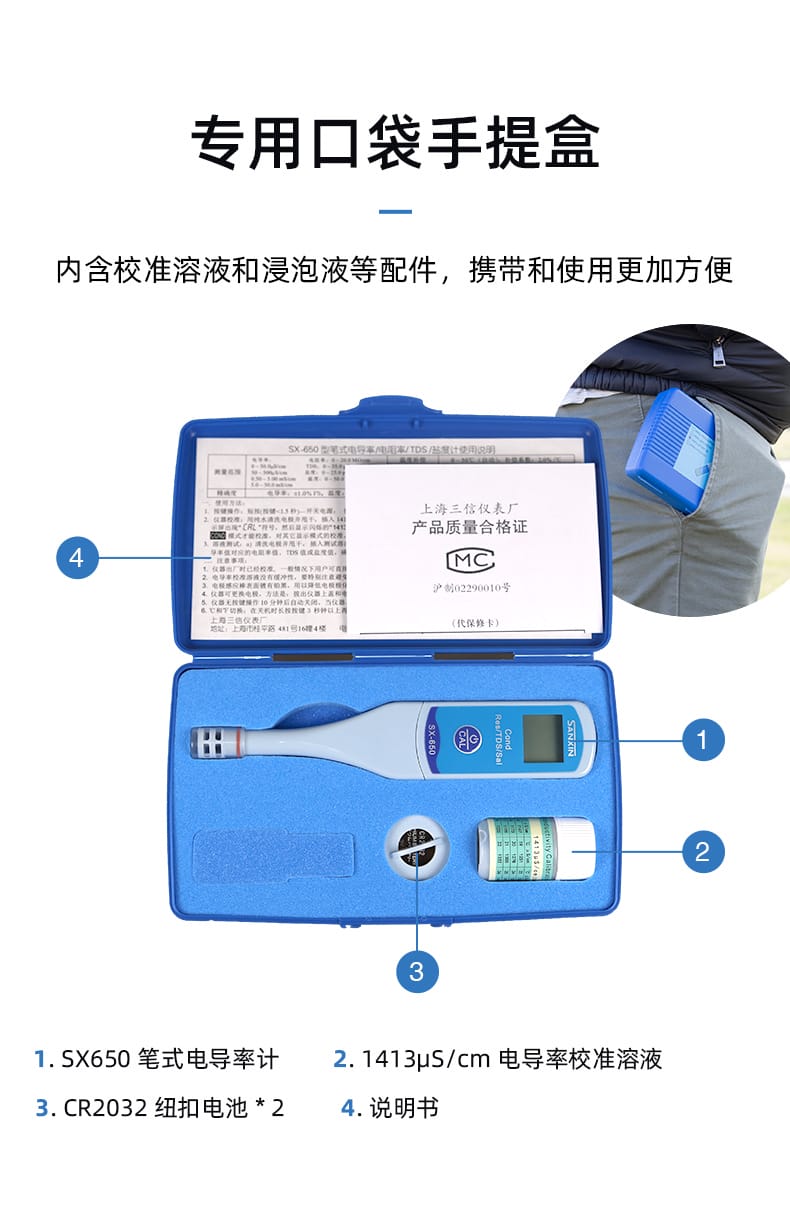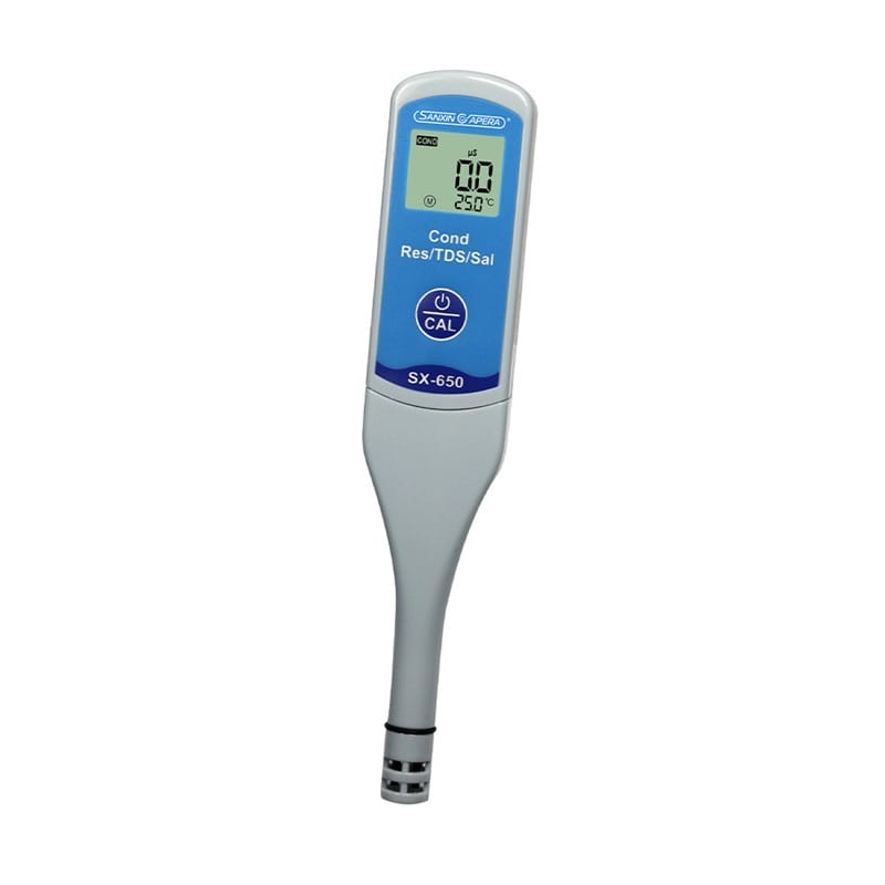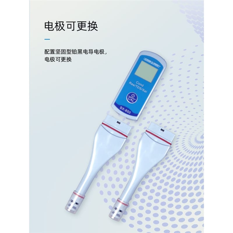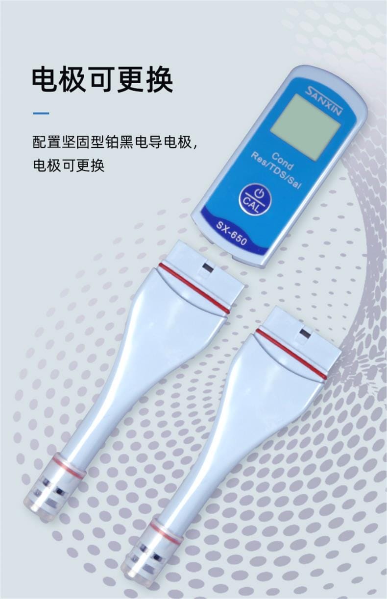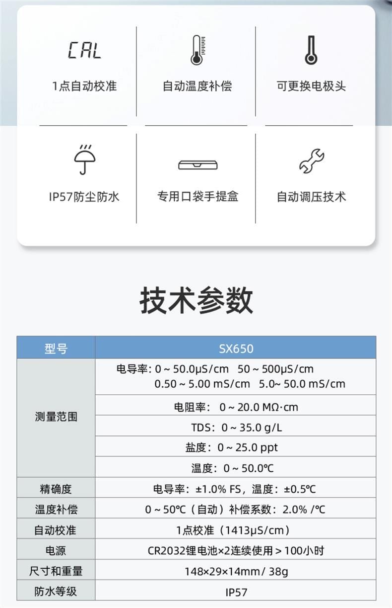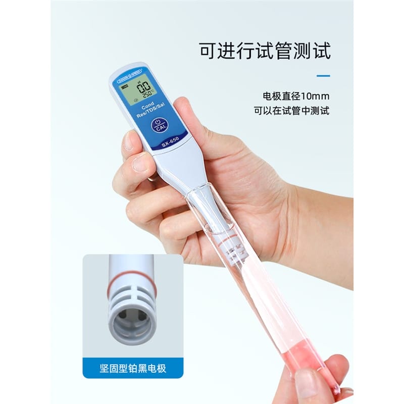 SANXIN SX650轻薄型专业电导率测试笔由上海三信沛瑞仪器科技有限公司(SANXIN APERA)研发生产,是一款集电导率、电阻率、TDS、盐度和温度测量于一体的便携式水质分析工具。产品采用智能芯片设计,支持1点自动校准和0~50℃自动温度补偿,确保测量精准可靠。机身尺寸仅为148×29×14mm,重量仅38g,便于随身携带,适合现场及野外使用。 SX650配备坚固的铂黑电极,电极直径为10mm,可在试管等小容量容器中直接测试,操作简便,仅需一个按键即可完成开关机、模式切换与校准。支持COND、RES、TDS、SAL四种测量模式循环切换,并具备IP57级防尘防水性能,适应多种复杂环境。 技术参数: - 电导率测量范围:0~50.0μS/cm 至 5.0~50.0mS/cm - 电阻率:0~20.0MΩ·cm - TDS:0~35.0g/L - 盐度:0~25.0ppt - 温度范围:0~50.0℃ - 精度:电导率±1.0%FS,温度±0.5℃ - 电源:CR2032锂电池×2,连续使用超100小时 应用领域包括教育科研、环境监测、饮品质量控制、水处理、水产养殖、水培、游泳池与温泉管理等。每台仪器出厂前均已校准,附带1413μS/cm校准液、浸泡液、说明书及专用口袋手提盒,开箱即用。 本产品享受2年质保服务,支持7天无理由退换货,提供13%增值税专用发票。三信专注电化学水质分析30年,产品远销欧美日等50多个国家,品质值得信赖。