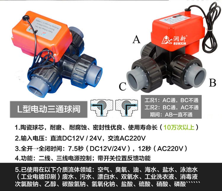 〉 润新电动塑料L型三通球阀 UPVC胶粘开关带反馈三通电动球阀AC220V