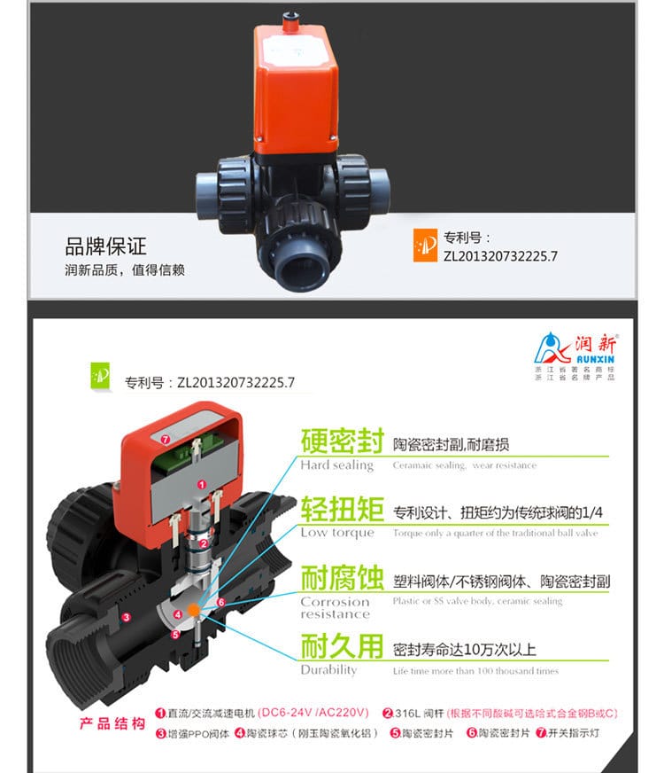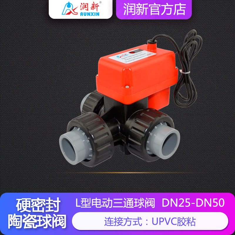 润新RUNXIN电动三通球阀采用高性能氧化铝陶瓷芯,硬度高达HRA≥85°,具备优异的耐磨性、耐腐蚀性和密封性能,使用寿命超过10万次。产品提供多种型号(DN25-DN50),支持二线、三线及带位置反馈控制模式,输入电压涵盖DC12V/24V和AC220V,启闭时间短(7.5秒起)。阀体材质为增强PPO,耐酸碱,搭配316L不锈钢阀杆或可选哈氏合金,适用于空气、臭氧、海水、盐水、废水、双氧水、氢氧化钠、盐酸等多种腐蚀性介质。广泛应用于水处理、电镀废水、超纯水系统、化工、能源、医疗设备及农业灌溉等领域。具备IP65防护等级,支持定时开关、断电复位功能,是替代传统球阀和电磁阀的理想选择。