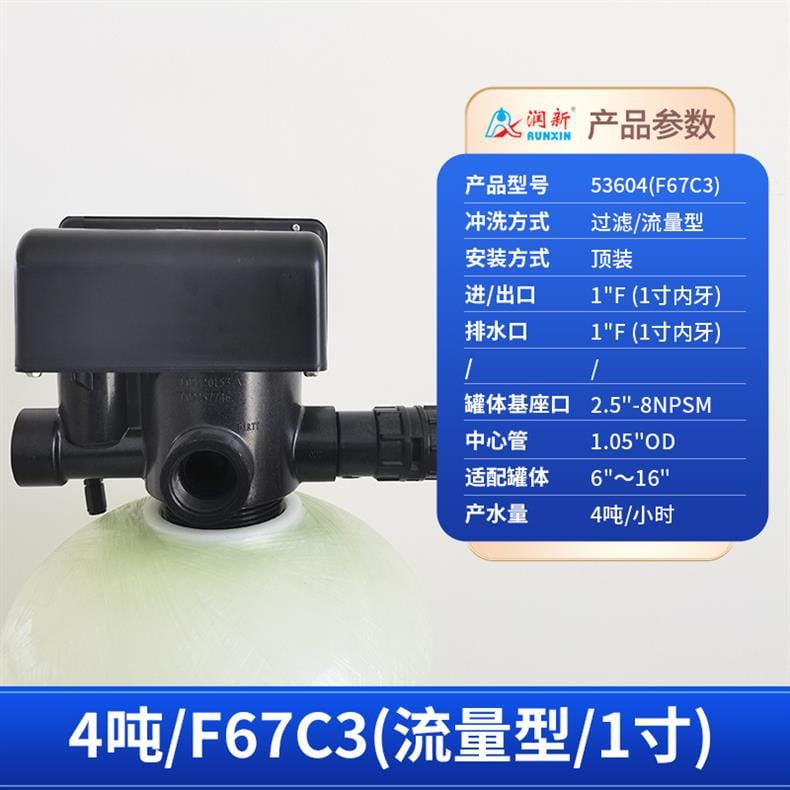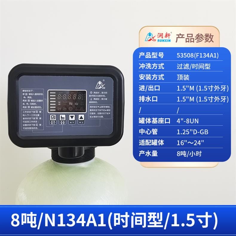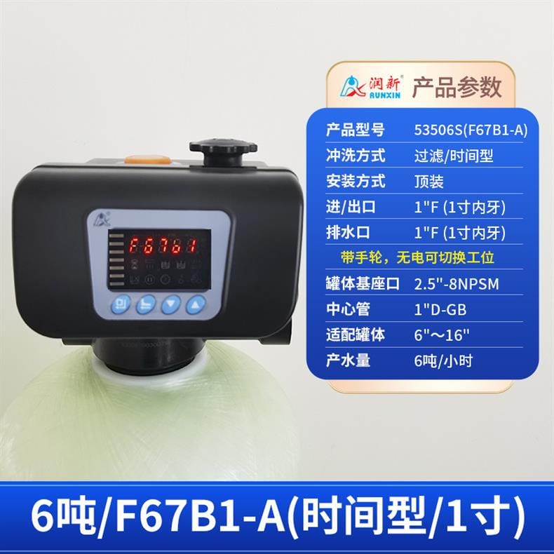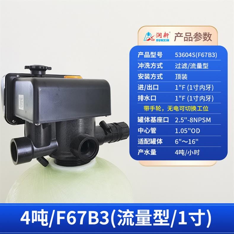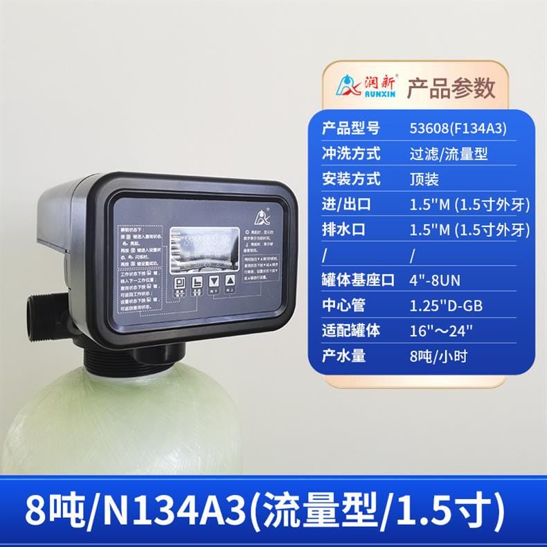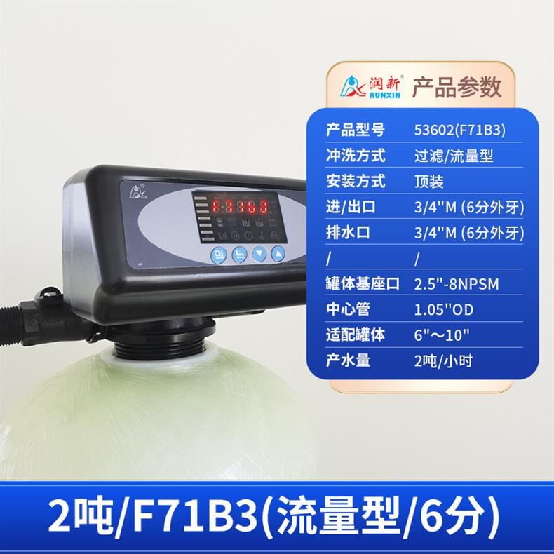 润新(RUNXIN)提供全系列软化水控制系统解决方案,产品涵盖时间型与流量型全自动控制阀。主要型号包括: - **53502(F71B1)**:产水量2吨/小时,3/4"外牙接口,适配6"~10"罐体,时间型控制,顶装安装。 - **53602(F71B3)**:同为2吨/小时,流量型控制,其余参数与F71B1一致。 - **53504S(F67B1) / 53604S(F67B3)**:产水量4吨/小时,1"内牙接口,带手轮设计,断电可手动切换工位,分别支持时间型与流量型冲洗控制。 - **53504(F67C1) / 53604(F67C3)**:性能相同,适配6"~16"罐体,中心管1.05"OD,具备稳定耐用结构。 - **53506S(F67B1-A) / 53506-A(F67C1-A)**:产水量提升至6吨/小时,采用1"D-GB中心管,适用于大流量需求场景。 - **53508(F134A1) / 53608(F134A3)**:产水量8吨/小时,配备1.5"外牙接口,罐体基座口为4"-8UN,适配16"~24"大罐体。 - **53510(N75A1) / 53510B(N75B1)**:最大产水量达10吨/小时,2"外牙接口,支持顶装或侧装(含连接件),适合工业级应用。 所有型号均采用高强度工程塑料与耐腐蚀材料制造,运行稳定,维护简便,是软化水设备的核心控制部件,广泛应用于住宅、商用及工业水处理系统。