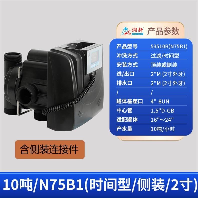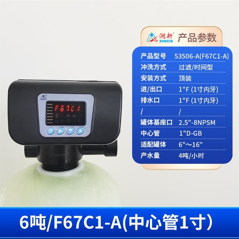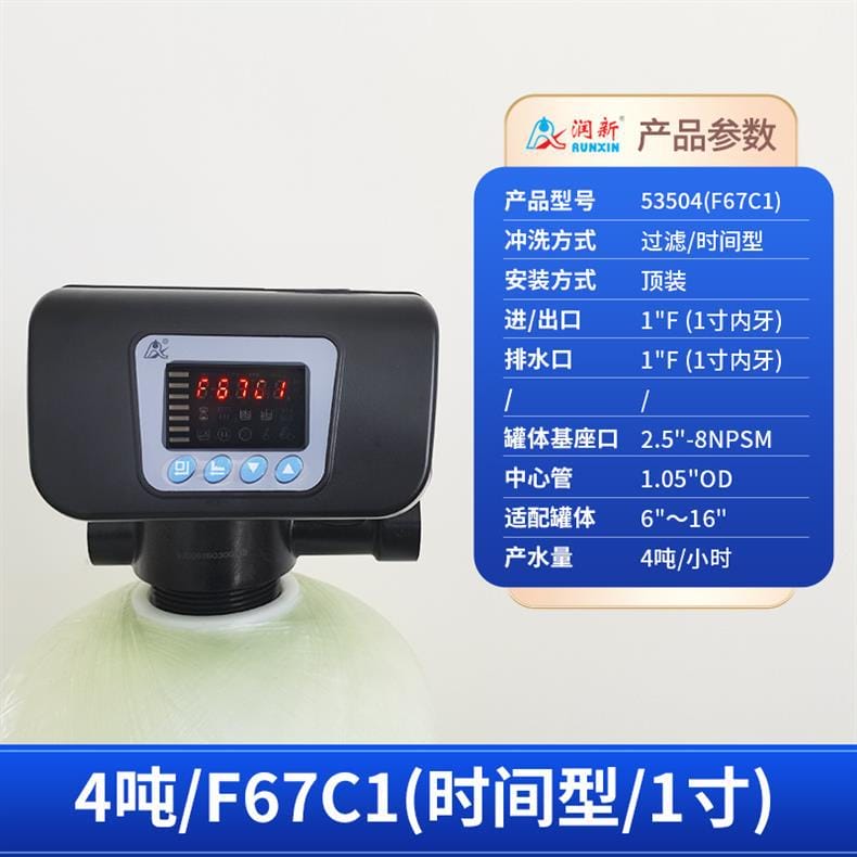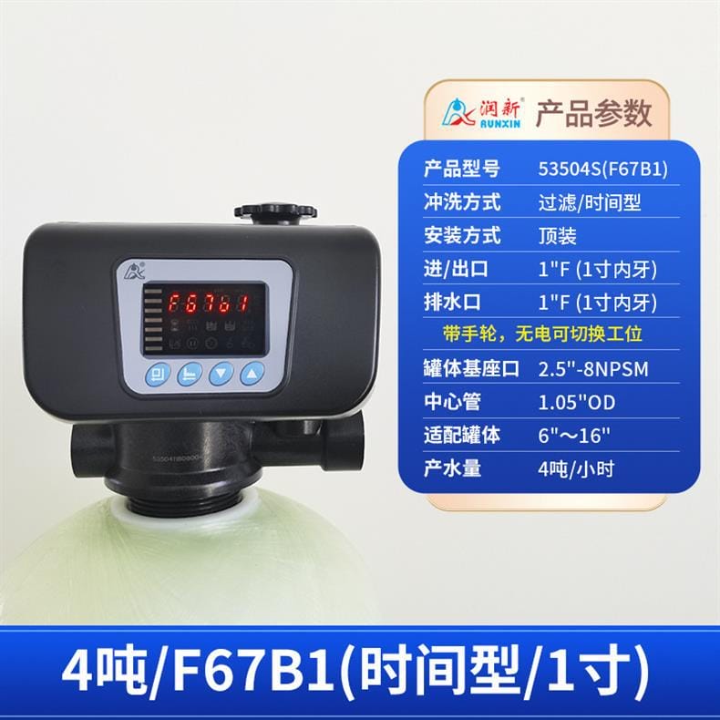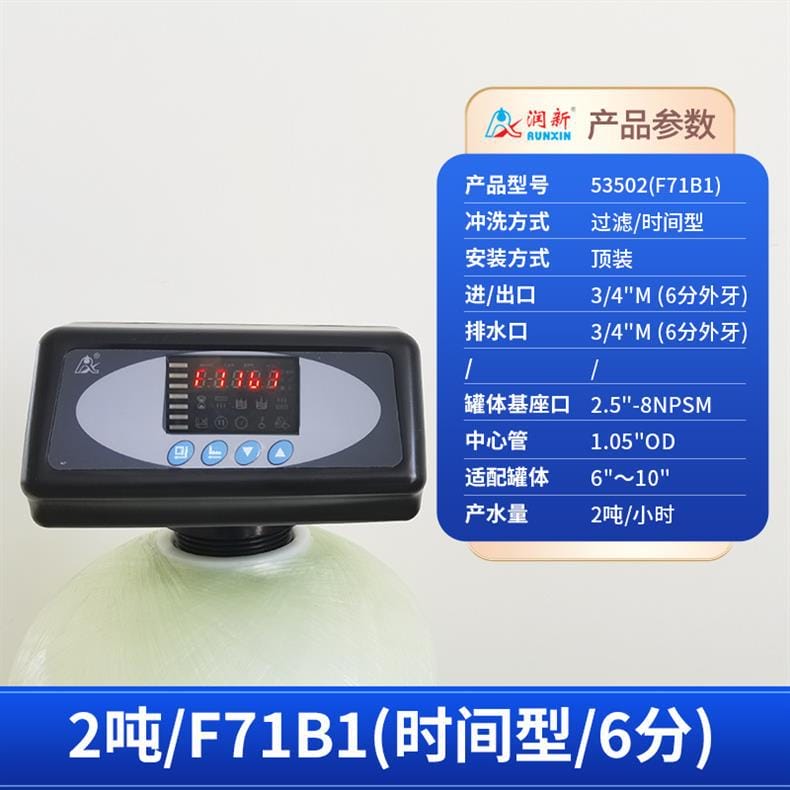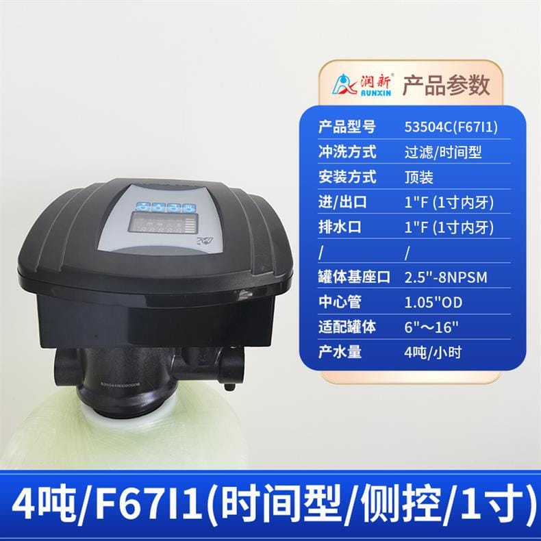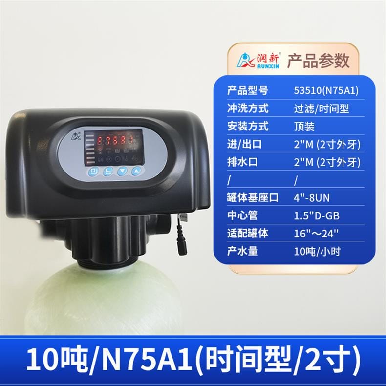 润新(RUNXIN)提供全系列软化水控制系统解决方案,产品涵盖时间型与流量型全自动控制阀。主要型号包括: - **53502(F71B1)**:产水量2吨/小时,3/4"外牙接口,适配6"~10"罐体,时间型控制,顶装安装。 - **53602(F71B3)**:同为2吨/小时,流量型控制,其余参数与F71B1一致。 - **53504S(F67B1) / 53604S(F67B3)**:产水量4吨/小时,1"内牙接口,带手轮设计,断电可手动切换工位,分别支持时间型与流量型冲洗控制。 - **53504(F67C1) / 53604(F67C3)**:性能相同,适配6"~16"罐体,中心管1.05"OD,具备稳定耐用结构。 - **53506S(F67B1-A) / 53506-A(F67C1-A)**:产水量提升至6吨/小时,采用1"D-GB中心管,适用于大流量需求场景。 - **53508(F134A1) / 53608(F134A3)**:产水量8吨/小时,配备1.5"外牙接口,罐体基座口为4"-8UN,适配16"~24"大罐体。 - **53510(N75A1) / 53510B(N75B1)**:最大产水量达10吨/小时,2"外牙接口,支持顶装或侧装(含连接件),适合工业级应用。 所有型号均采用高强度工程塑料与耐腐蚀材料制造,运行稳定,维护简便,是软化水设备的核心控制部件,广泛应用于住宅、商用及工业水处理系统。