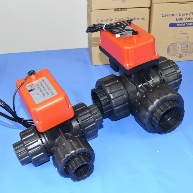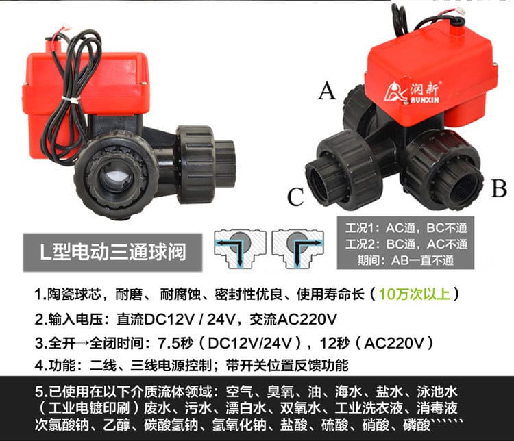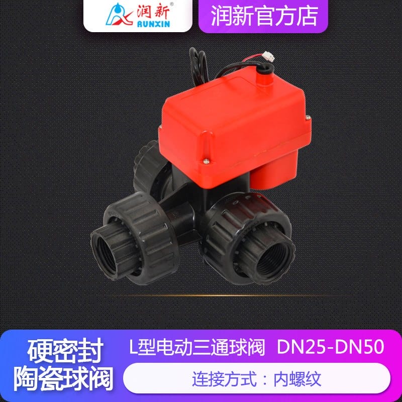 〉 润新电动塑料三通球阀陶瓷芯24V内螺纹L型三通球阀DN25DN32DN50