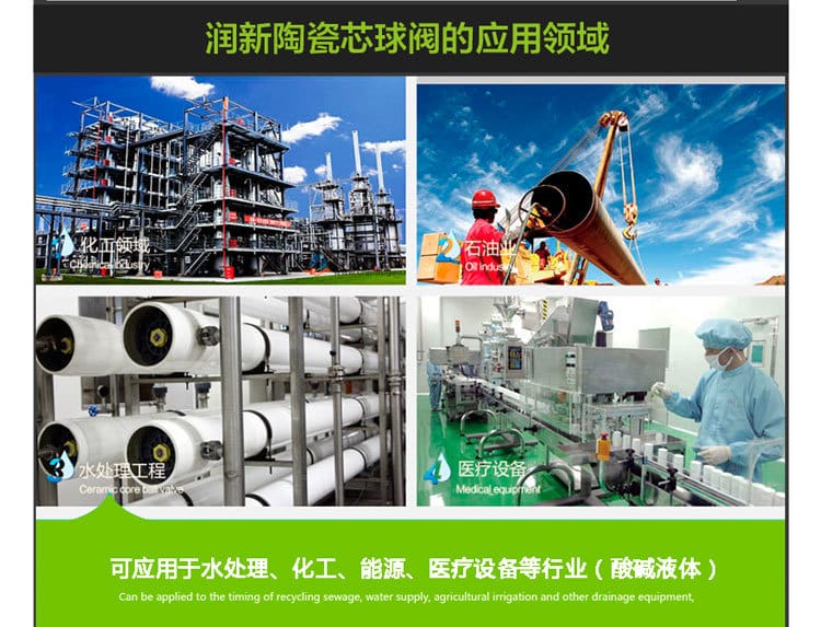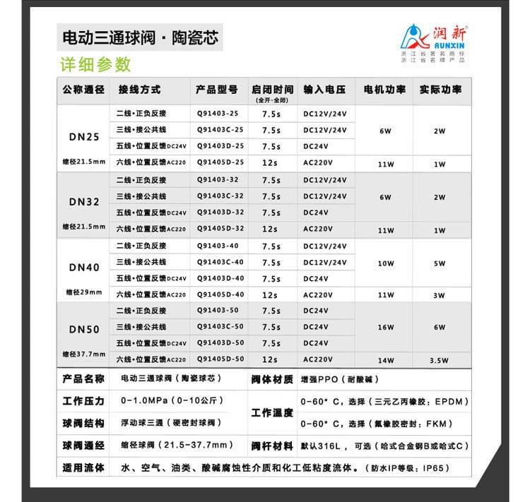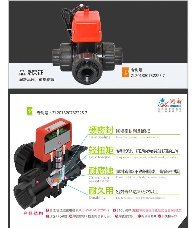 润新(RUNXIN)陶瓷芯电动三通球阀采用高性能氧化铝陶瓷阀芯,硬度高达HRA≥85°,具备优异的耐磨性、耐腐蚀性和密封性能,使用寿命超过10万次。产品广泛应用于水处理、化工、能源、医疗设备等行业,适用于空气、臭氧、油类、海水、盐水、废水、污水、双氧水、酸碱液(如盐酸、硫酸、氢氧化钠)等多种腐蚀性介质。 该系列电动三通球阀为L型流道设计,支持两种工况切换:AC通BC不通,或BC通AC不通,AB始终关闭。提供多种控制模式:二线制(正负反接)、三线制(公共线控制)、五线制(带DC24V位置反馈)、六线制(带AC220V位置反馈),满足自动化系统集成需求。 启闭时间短,DC12V/24V下仅需7.5秒,AC220V下为12秒。阀体采用增强PPO材质,耐酸碱腐蚀;阀杆默认为316L不锈钢,可选哈氏合金B/C以适应强腐蚀环境。工作压力0-1.0MPa,工作温度0-60°C,密封材料可选EPDM或FKM氟橡胶,防护等级达IP65。 产品型号包括Q91403-25/-32/-40/-50(直流)及Q91405D系列(交流),公称通径DN25至DN50,部分为缩径设计。凭借专利低扭矩结构设计,启闭扭矩仅为传统球阀的1/4,运行更平稳节能。 润新陶瓷芯球阀已获得国家专利(ZL201320732225.7),在密封性、耐用性和可靠性方面显著优于传统不锈钢球阀和电磁阀,是高腐蚀、高磨损工况下的理想选择。