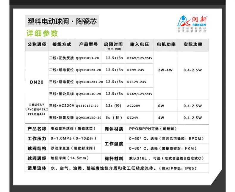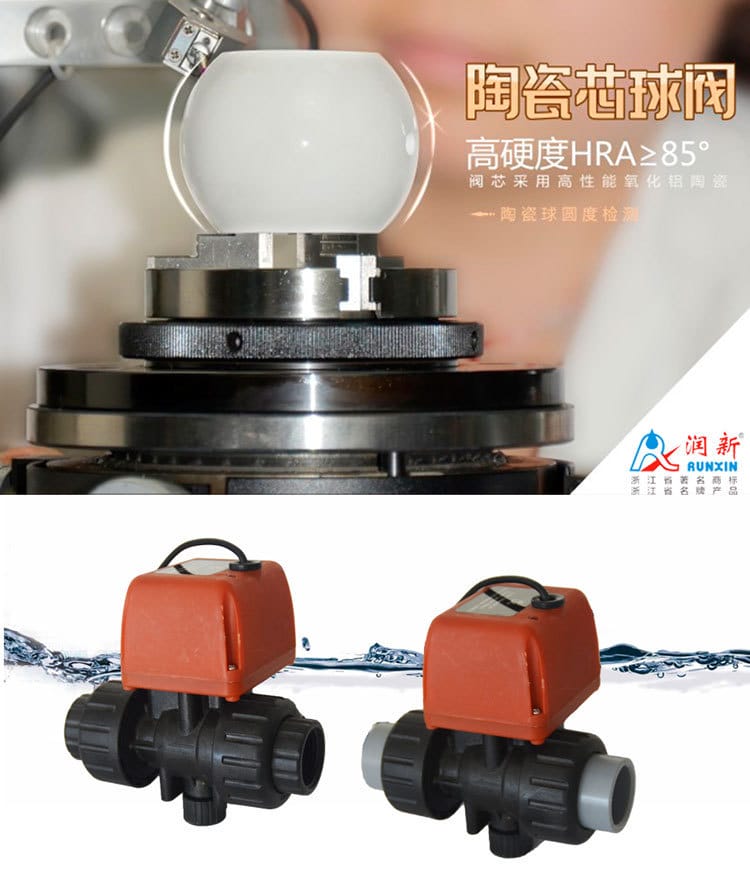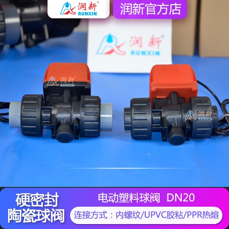 润新(RUNXIN)陶瓷芯电动球阀采用高性能氧化铝陶瓷阀芯(HRA≥85°),具有优异的耐磨性、耐腐蚀性和长久密封寿命(超过10万次)。阀体材质可选PPO或PPH,耐酸碱性强,适用于水、空气、油类、酸碱腐蚀性介质及化工低粘度流体。产品提供多种控制模式:二线正负反接、断电复位、三线控制、交流AC220V及五线带位置反馈,满足不同自动化需求。启闭时间短(3-12.5秒),工作压力0-1.0MPa,防护等级IP65,适用温度0-60°C。广泛应用于水处理、电镀废水、超纯水系统、泳池水处理、工业清洗、医疗设备及农业灌溉等领域。支持内螺纹、UPVC胶粘、PPR热熔等多种连接方式,配置316L不锈钢阀杆(可选哈氏合金),确保长期稳定运行。