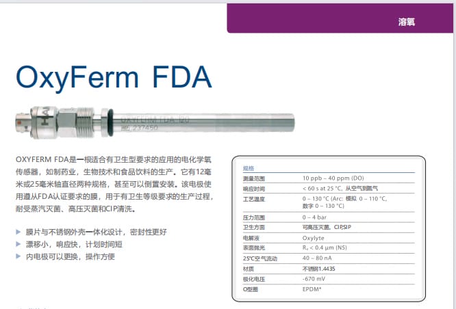 OxyFerm FDA是一款适用于高卫生标准应用的电化学氧传感器,广泛用于制药、生物技术和食品饮料生产。提供12mm和25mm两种轴径规格,支持倒置安装。传感器采用符合FDA认证的膜材料,可耐受蒸汽灭菌、高压灭菌和CIP清洗。膜片与不锈钢外壳一体化设计,密封性更佳,抗干扰能力强。具有漂移小、响应时间快(<60秒)、维护周期短等优点。内电极可更换,操作便捷。测量范围:10 ppb - 40 ppm(DO),温度范围:0-130℃(模拟输出0-110℃,数字输出0-130℃),压力范围:0-4 bar。表面抛光Ra <0.4μm(N5),材质为不锈钢1.4435,极化电压-670 mV,O型圈为EPDM。配套型号包括9889-Z80-00V,技术支持热线:400-082-6886。