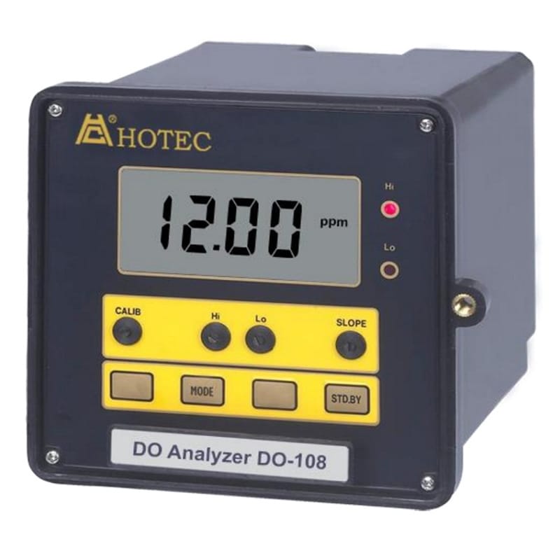 HOTEC DO-108溶氧度分析仪是一款专业用于水质溶解氧在线监测的智能控制器,广泛应用于废水处理、河川湖泊监测、海水及淡水养殖等领域。产品采用特殊防水外壳设计,通过IP-65防护等级认证,可在恶劣环境中稳定运行。配备超大型液晶显示屏(LCD),耐高温至90℃不变黑,适合户外长期使用。支持4-20mA隔离模拟输出,抗干扰能力强,并配备STDBY待机功能,便于设备维护和校准。设备具有双继电器控制功能(HI/LO),可实现高低限报警控制,设定点为2个。测量范围为0.00~20.00ppm,分辨率达0.01ppm,精度为±1%满量程。工作温度0~65℃,电源适配110/240VAC,50/60Hz。面板安装尺寸为135×135×182mm,适用于标准仪表开孔。是高可靠性、高性价比的溶氧监控解决方案。