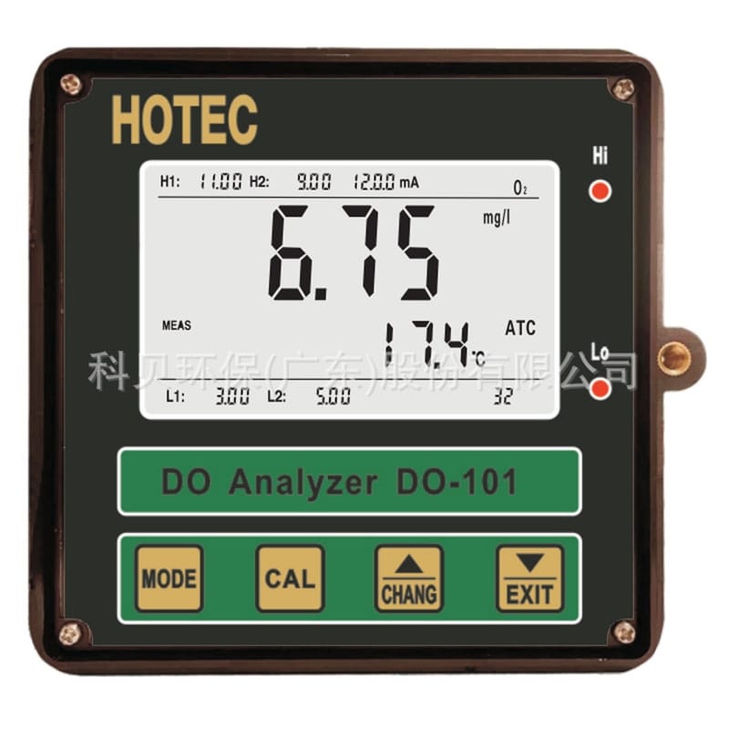 HOTEC科贝环保(广东)股份有限公司推出的DO-101M和DO-101Y型溶解氧分析仪,是一款高精度、稳定可靠的在线水质监测设备。产品采用不锈钢壳体设计,具备IP65防护等级,适用于污水处理、水产养殖、厌氧池及饮用水等多种工业与环保场合。 该分析仪测量范围为0至20.00 ppm,分辨率达0.01,精度为±0.01±1位数字,支持NTC-50K或PT1000传感器的自动(ATC)或手动(MTC)温度补偿。配备4.6英寸LCD显示屏,带白色背光和功能指示灯,实时显示溶氧(O2)、盐度(Sal)、mA输出值及报警设定点(H1/H2/L1/L2)。 设备提供4-20mA隔离信号输出(负载≤1KΩ),标准RS-485 Modbus通信接口,并内置HI/LO双继电器控制输出,可设置4个报警点,适用于自动化控制系统。电源支持220VAC或24VDC,工作温度0~65℃,满足多种安装环境需求。 安装方式为面板嵌入式(135×135×100mm),配高耐性加厚缆线,确保长期稳定运行。广泛应用于环保、水处理、工业过程控制等领域,源头厂家直供,支持技术选型与发票开具,提供完善的售前售后服务。
