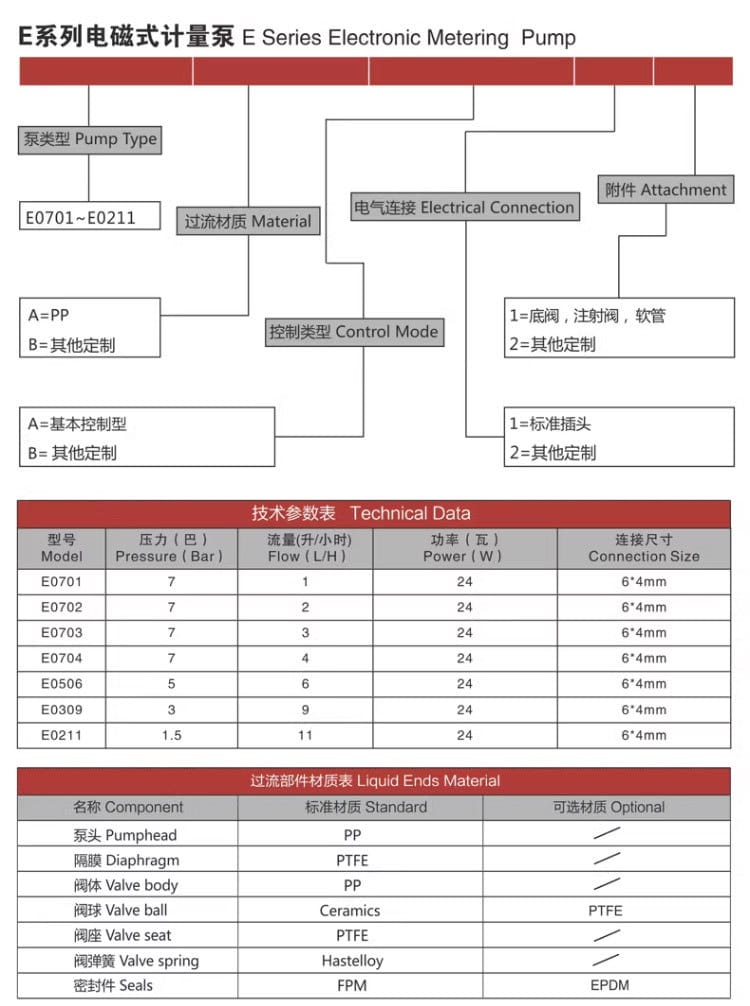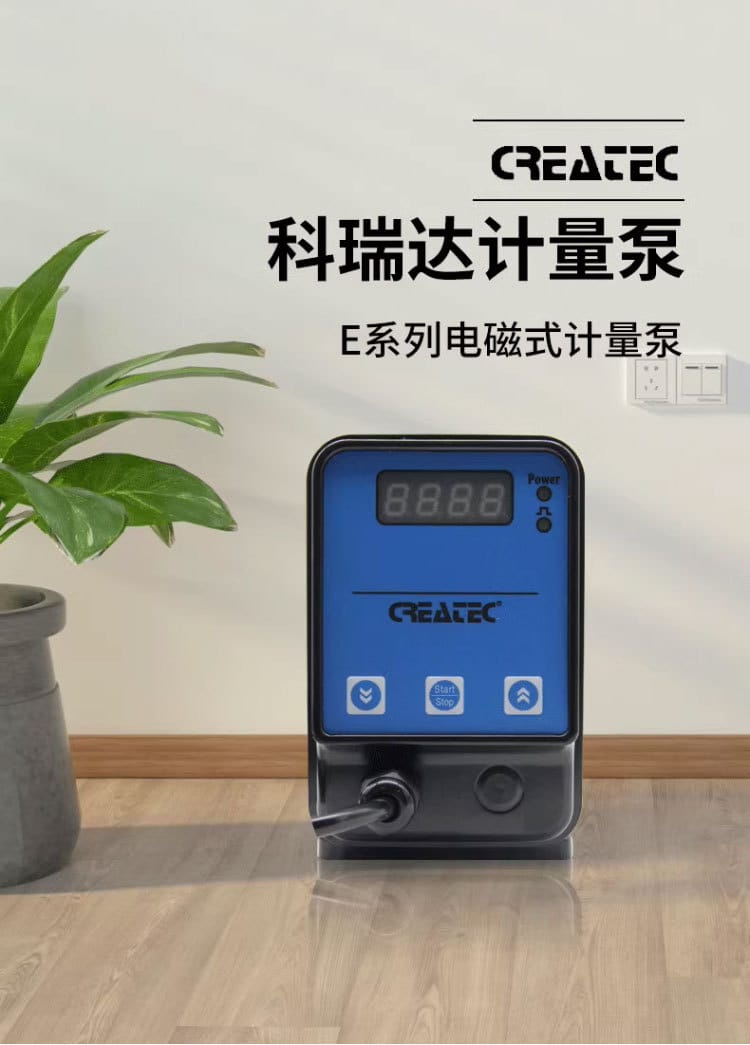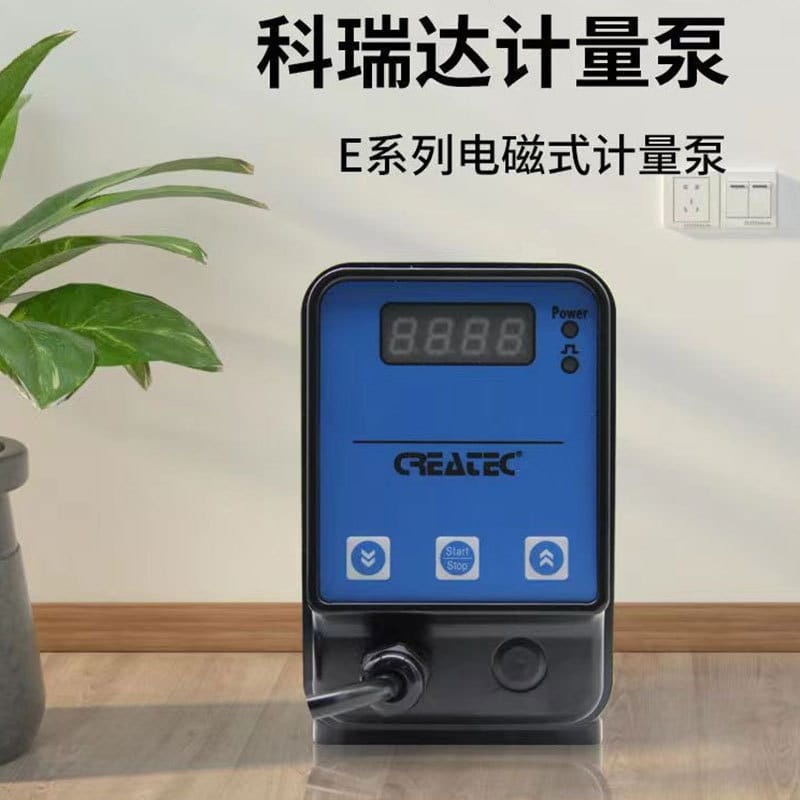 科瑞达E系列电磁式计量泵,集高颜值与强劲性能于一身,专为精确加药设计。泵头采用高强度PP材料,阀座与隔膜均使用PTFE精密加工,具备优异的耐腐蚀性,适用于多种化学介质。配备LED数码管显示,操作界面清晰直观,支持频率调节,控制精准。 该系列计量泵功率为24W,运行稳定,能耗低,流量范围覆盖1-11升/小时,最大压力可达7巴。过流部件如阀球可选陶瓷或PTFE,密封件可选FPM或EPDM,适应不同工况需求。 标配吸液管、排液管、底阀、注射阀及连接件,安装便捷。广泛应用于环保水处理、净化系统、化学制程、水产养殖及农业水肥一体化等场景。科瑞达E系列计量泵以可靠的品质和经济的价格,成为中小型加药系统的理想选择。