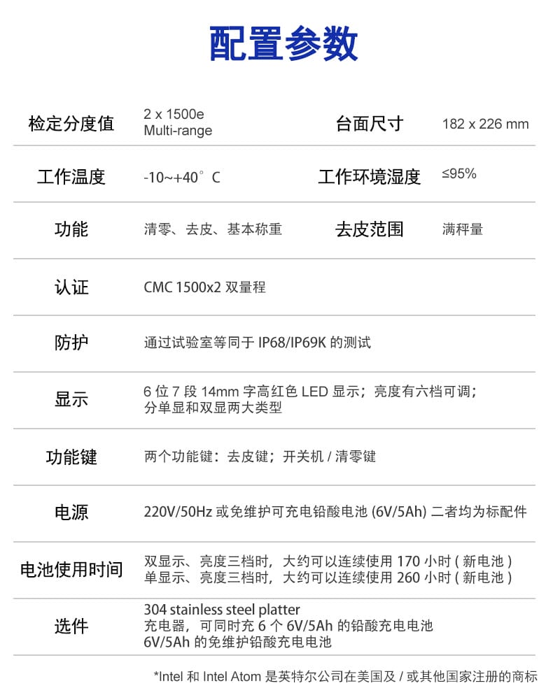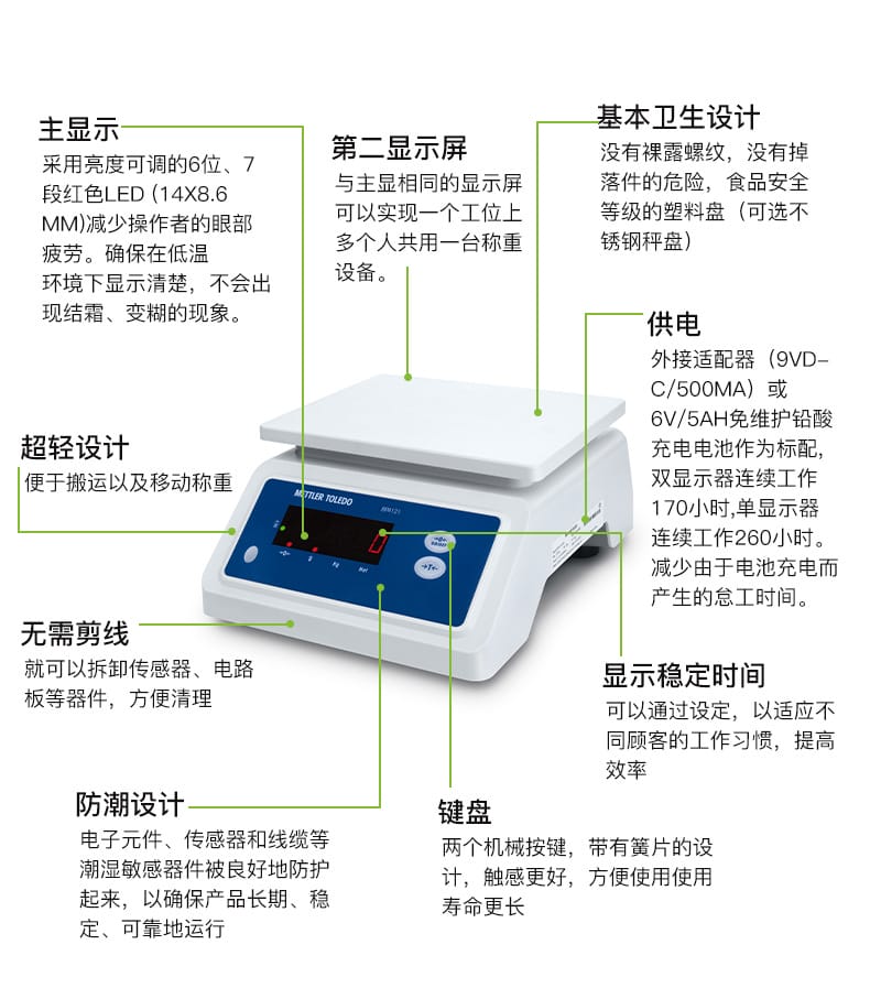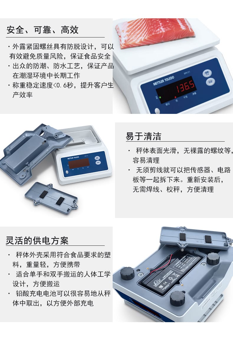 梅特勒托利多BPA121电子计重秤是一款专为恶劣潮湿环境设计的经济型便携秤,广泛应用于禽类、肉类、水产品、果蔬及零食熟食等食品加工企业。产品采用符合食品安全标准的卫生材质制造,整机通过RoHS认证,有效规避监管风险。 该计重秤具备出色的防潮、防水性能,整机支持水洗冲洗,防护等级达到IP68/IP69K标准。称重响应时间小于0.6秒,显著提升生产效率。秤体表面光滑无裸露螺纹,传感器与电路板可快速拆卸清洗,无需剪线或重新校准,清洁维护更便捷。 配备亮度可调的6位红色LED显示屏(单显/双显可选),字高14mm,六档调节适应不同光照环境,减少操作者视觉疲劳,确保低温环境下不结霜、不变糊。两个机械按键带簧片设计,触感清晰,使用寿命更长。 供电方面支持外接适配器(9V DC/500mA)或6V/5Ah免维护铅酸充电电池,双显示器连续工作达170小时,单显示器可达260小时,大幅降低因充电导致的停机时间。秤体采用轻量化食品级塑料外壳,符合人体工学设计,便于单手或双手搬运。 主要参数:最大量程30kg,检定分度值e=20g;台面尺寸182×226mm;工作温度-10°C至+40°C,湿度≤95%。标配去皮、清零、基本称重功能,CMC认证双量程设计,满足多种称重要求。 可选配件包括304不锈钢秤盘、多槽充电器(支持6块电池同时充电)及备用电池,灵活适配不同使用场景。是零售、加工行业高效、安全、可靠的称重好帮手。
