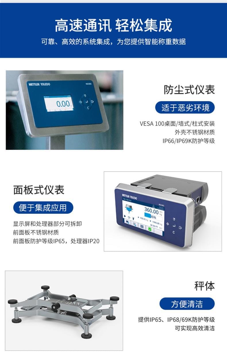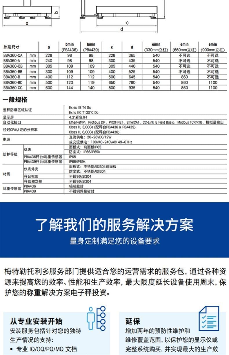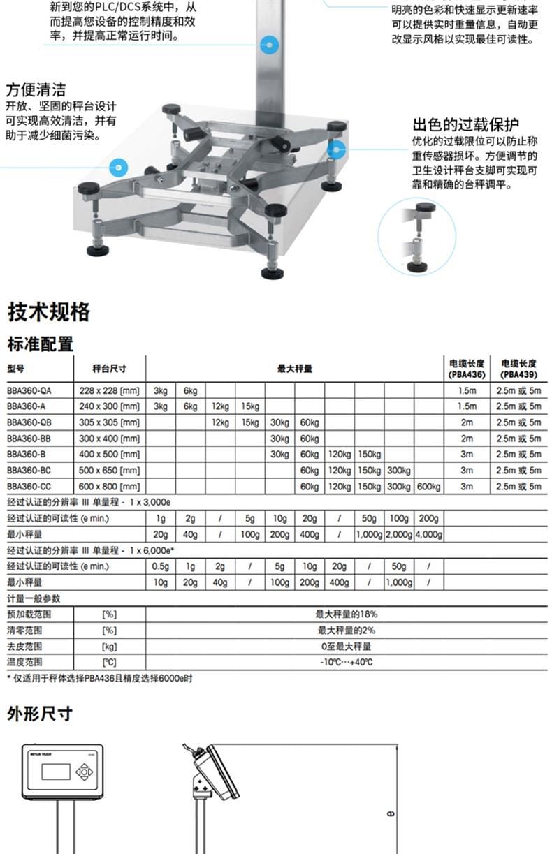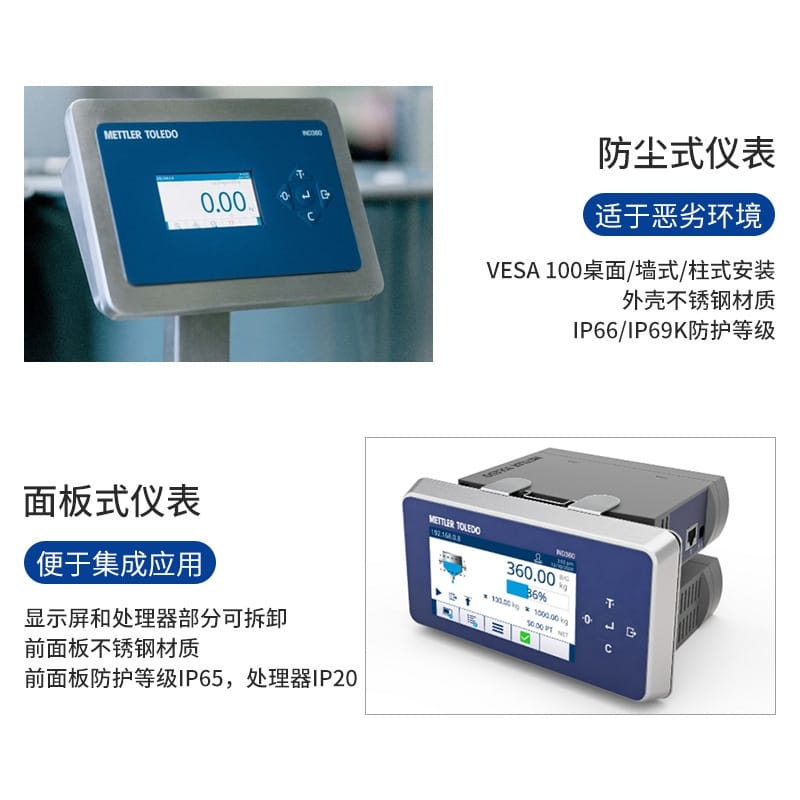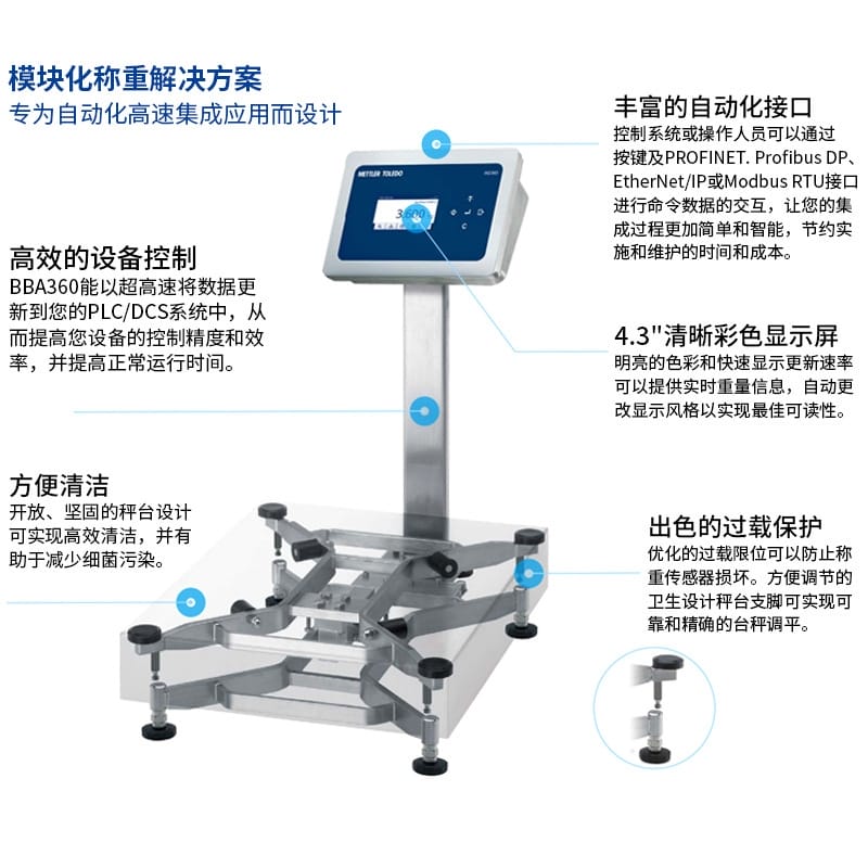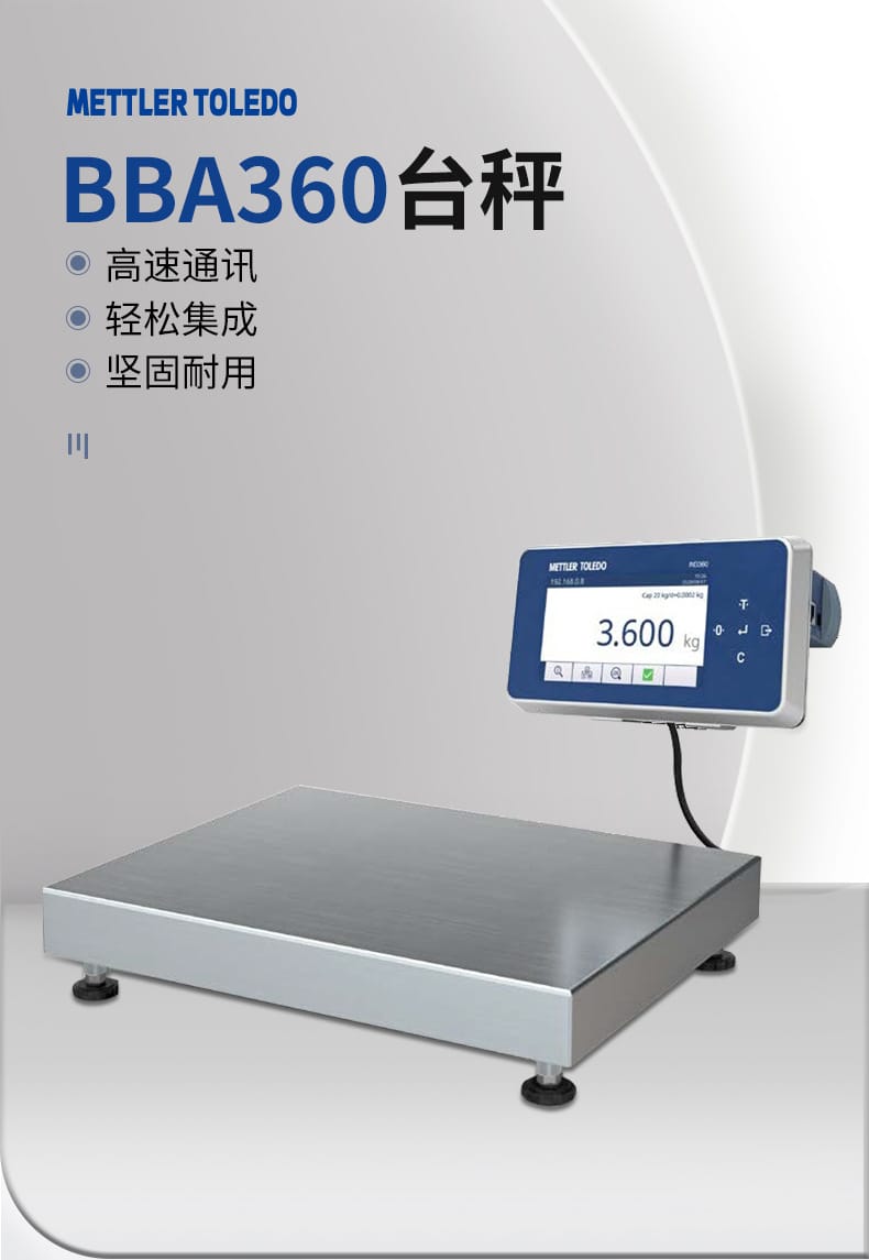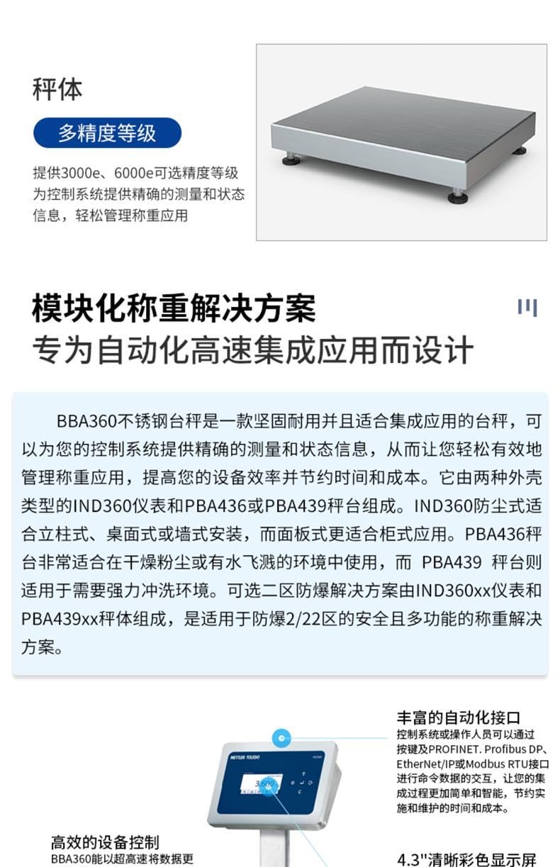梅特勒托利多BBA360不锈钢台秤是一款专为自动化高速集成应用设计的模块化称重解决方案。由IND360系列仪表与PBA436/PBA439秤台组成,适用于干燥粉尘、水溅或需强力冲洗的严苛环境。产品具备IP65至IP68/IP69K高等级防护,采用不锈钢AISI304材质,耐腐蚀、易清洁,有效防止细菌污染。支持PROFINET、EtherNet/IP、Modbus RTU等多种自动化接口,实现与PLC/DCS系统的高速数据交互,提升控制精度和设备效率。提供3000e和6000e两种精度等级选择,最小可读性达0.5g,确保测量精准可靠。4.3英寸彩色TFT显示屏清晰易读,支持面板式或防尘式安装,适应多种工业场景。可选Ex防爆型号(Ex ec IIB T4 Gc / Ex tc IIIC T130℃ Dc),满足2区/22区防爆要求。广泛应用于食品、制药、化工等对卫生与安全要求严苛的行业,是高效、稳定、智能的工业称重优选方案。