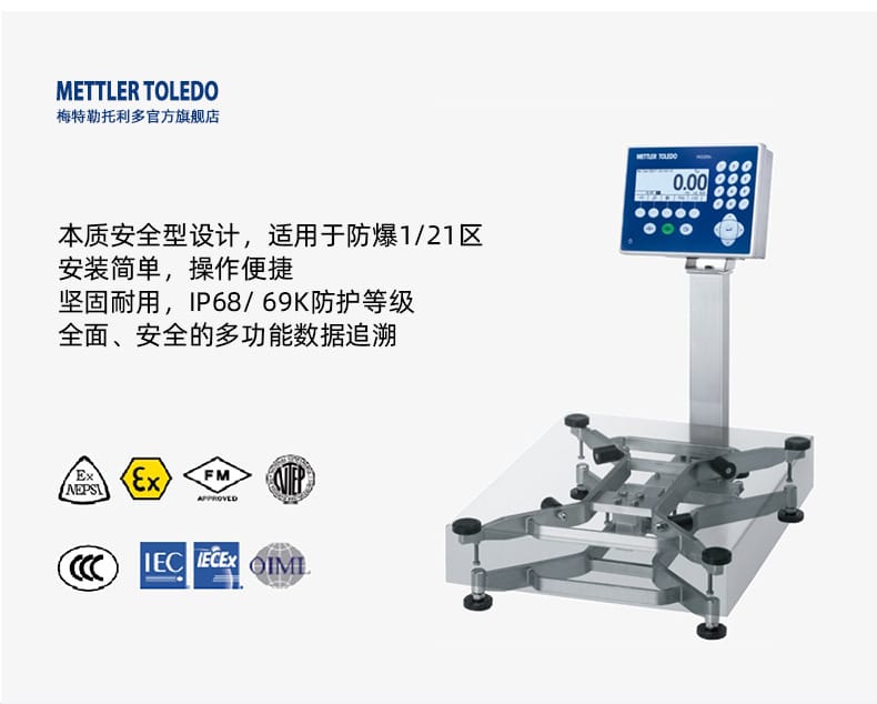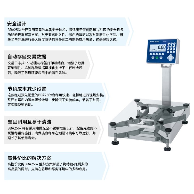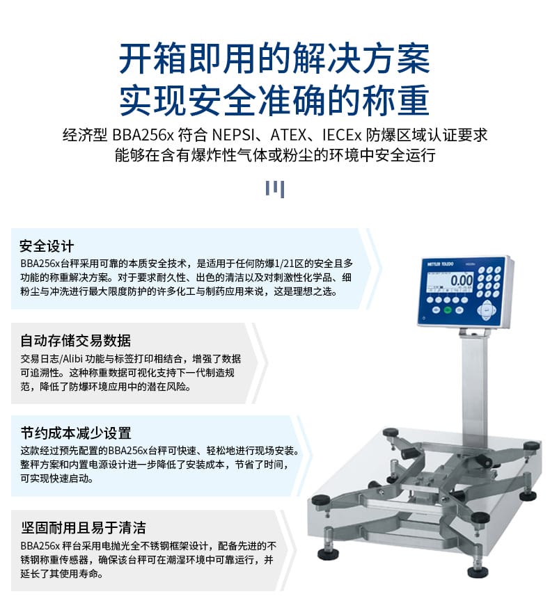 梅特勒托利多(METTLER TOLEDO)BBA256x系列防爆台秤是一款专为危险环境设计的高性价比称重解决方案,适用于防爆1区/21区。采用本质安全型技术,通过NEPSI、ATEX、IECEx等多项全球防爆认证,确保在易燃易爆气体或粉尘环境中安全运行。