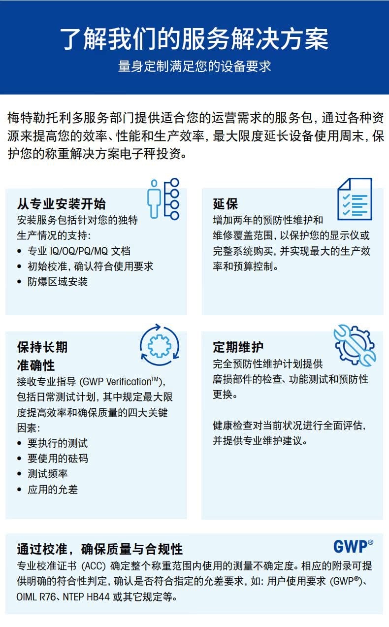 配套梅特勒托利多专业服务方案,包括预防性维护、IQ/OQ验证、校准服务(GWP Verification™)和延保支持,保障长期称重准确性与设备可靠性,最大化生产效率并保护投资。