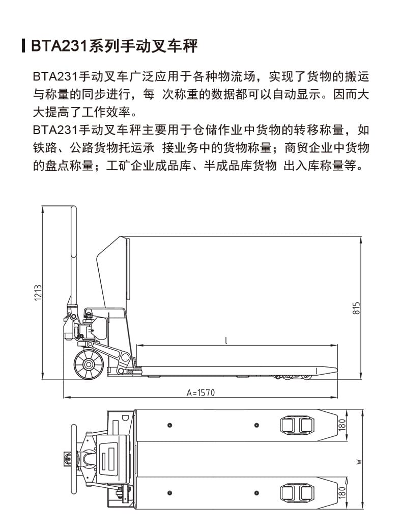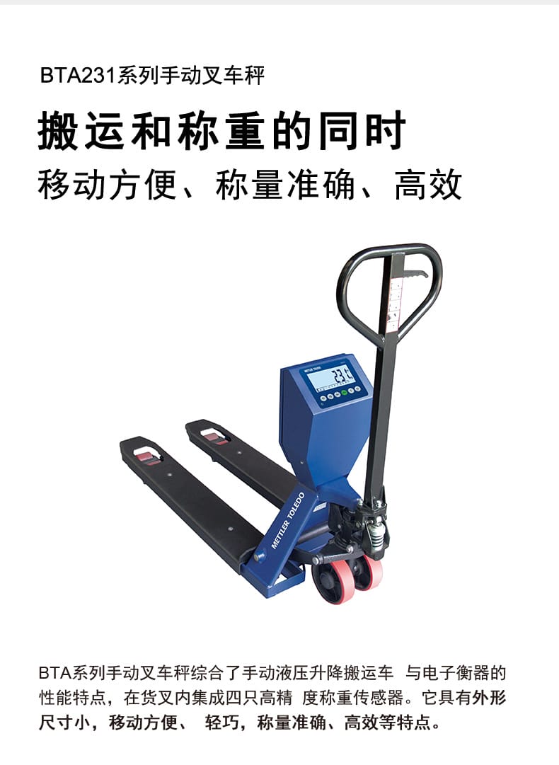 梅特勒托利多(METTLER TOLEDO)BTA231系列手动叉车秤集成了手动液压升降搬运车与电子衡器的优势,内置四只高精度称重传感器,实现货物搬运与称重同步进行。该设备外形紧凑、移动灵活,适用于仓储、物流、商贸及工矿企业中的货物转移与称量场景,如铁路公路托运、库存盘点、出入库管理等。