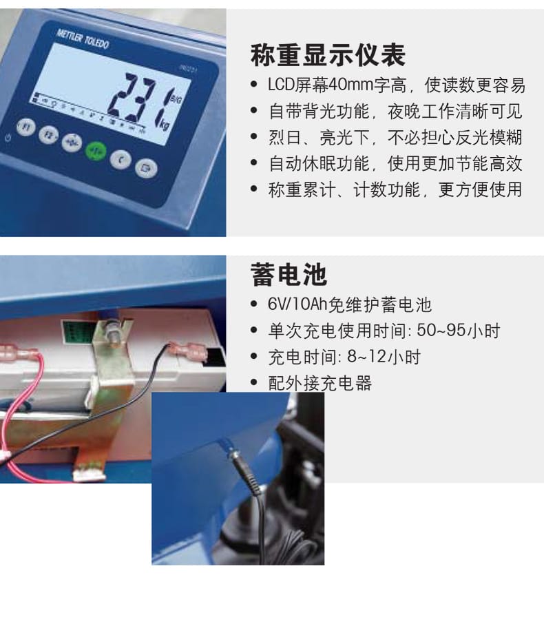 产品具备LCD大屏显示(字高40mm),带背光功能,适应强光或夜间作业,支持称重累计与计数功能,配备6V/10Ah免维护蓄电池,单次充电可持续使用50至95小时。设备工作稳定可靠,操作轻便,转向灵活,可在不平整路面顺畅行驶。