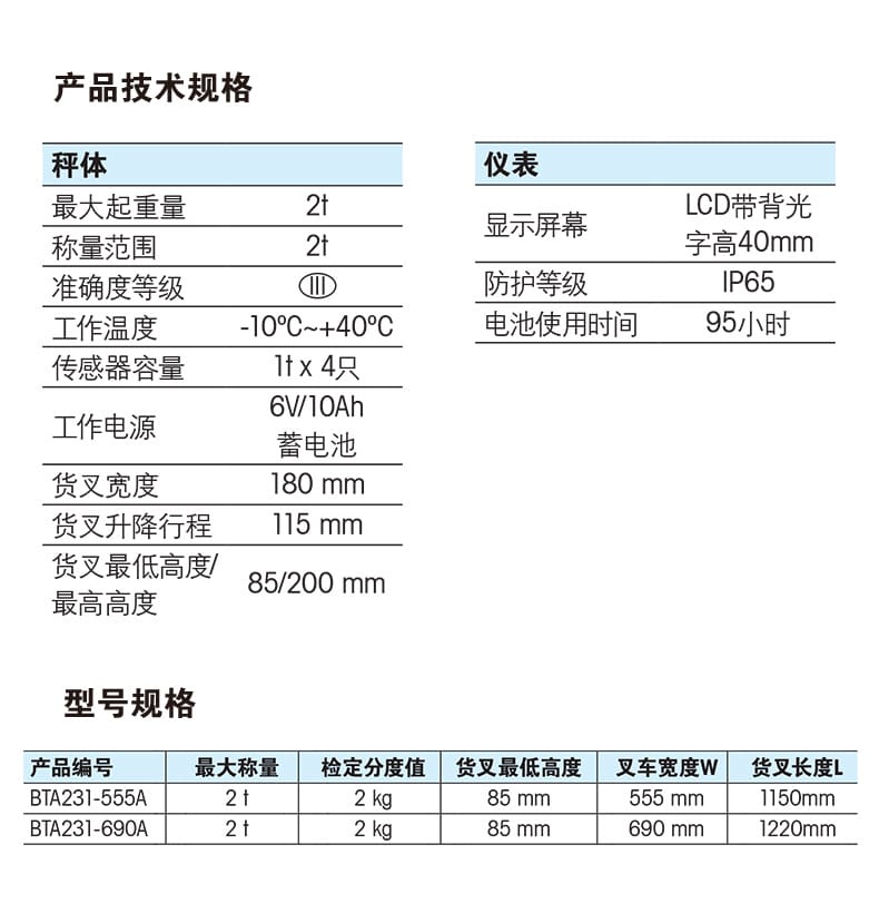 技术参数:最大起重量2吨,准确度等级III级,检定分度值2kg,货叉宽度可选555mm或690mm,升降行程115mm,最低高度85mm,防护等级IP65,仪表带自动休眠功能,节能环保。