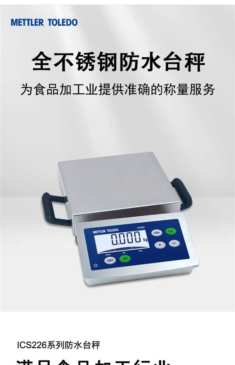 梅特勒托利多ICS226系列全不锈钢防水台秤专为食品加工业设计,适用于肉食品、禽类和水产加工等对卫生与精度要求严苛的环境。整秤采用AISI304不锈钢材质,具备卓越的防水防尘性能,仪表防护等级达IP69K,秤体达IP65,可在潮湿、高温冲洗环境下稳定运行。