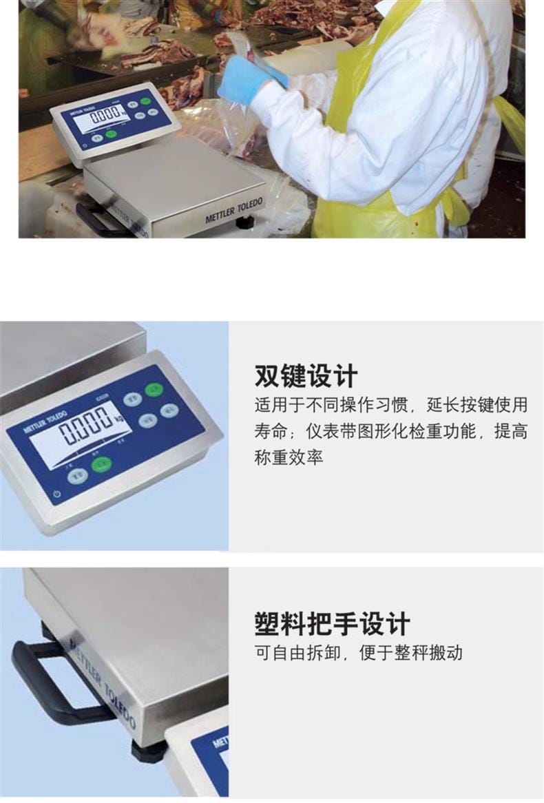 产品配备明亮清晰的白色背光LCD显示屏,可选6000d或7500d分辨率,支持简单称重、单位转换和图形化检重功能,双键设计适配不同操作习惯,延长使用寿命。可拆卸塑料把手方便整秤移动,前置或后置仪表安装满足多样化使用需求。