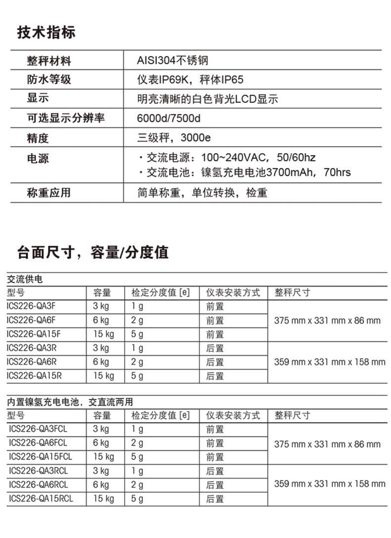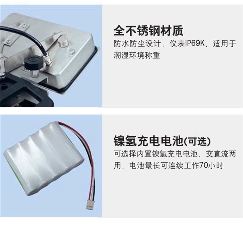 支持交直流两用电源配置,可选内置3700mAh镍氢充电电池,最长连续工作达70小时,确保在断电或移动场景下持续作业。提供3kg、6kg、15kg多种量程选择,精度达三级秤标准(3000e),全面满足生产线上高效精准称重需求。