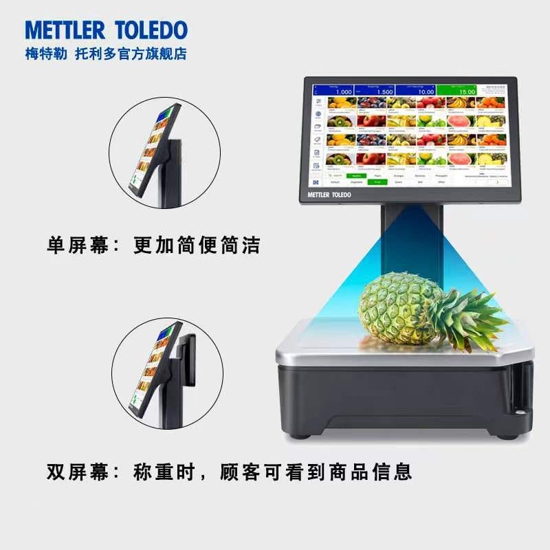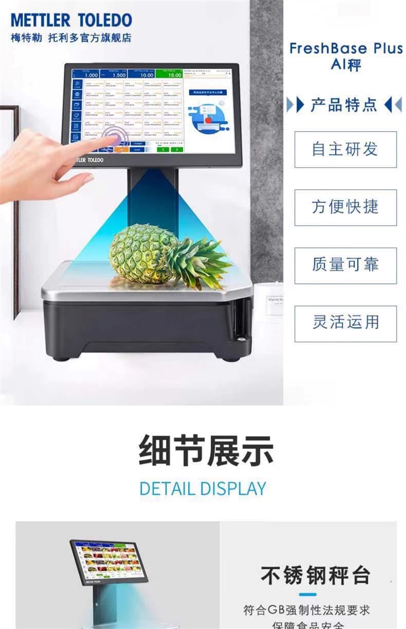 梅特勒托利多FreshBase Plus AI智能称重秤是一款专为现代零售环境设计的高性能称重解决方案。产品配备15.6英寸超大高清电容式触摸屏(分辨率1920×1080),支持无级倾角调节,操作便捷;客显屏为7英寸(分辨率1024×600),信息展示清晰。内置2英寸高速标签/收据打印机,打印速度高达125mm/s,确保高效出单。