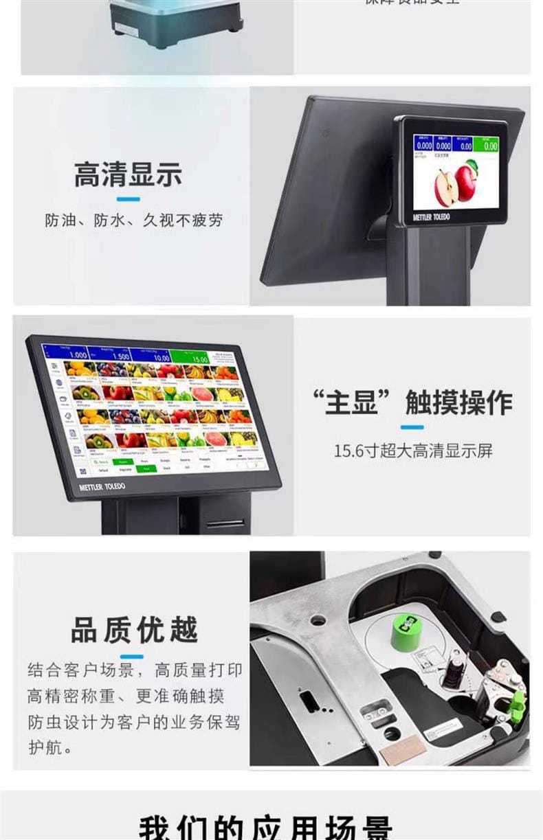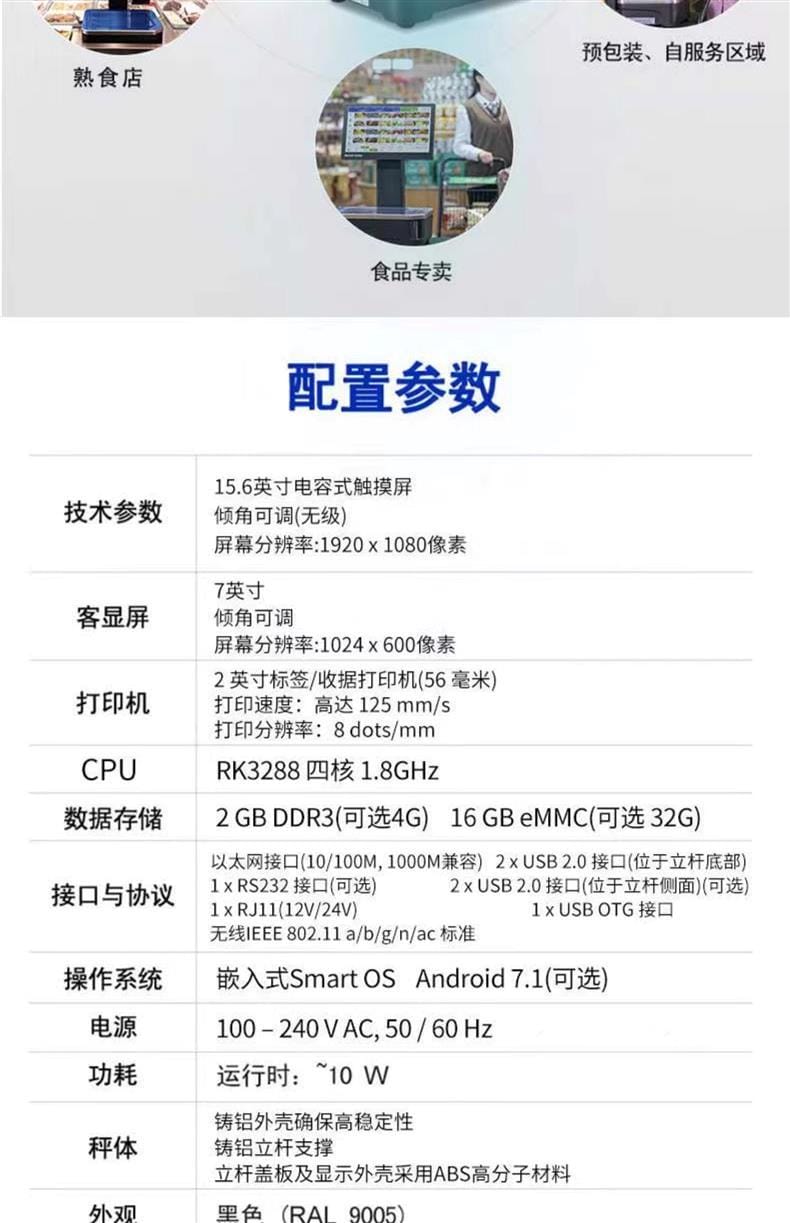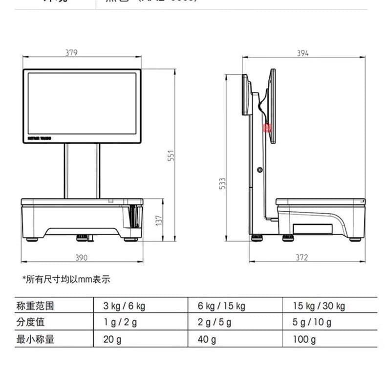 提供多种称重规格:3kg/6kg(分度值1g/2g)、6kg/15kg(分度值2g/5g)、15kg/30kg(分度值5g/10g),最小称量分别为20g、40g、100g,满足不同商品称重要求。广泛应用于超市生鲜、熟食店、食品专卖店、预包装区及自助称重结算场景。