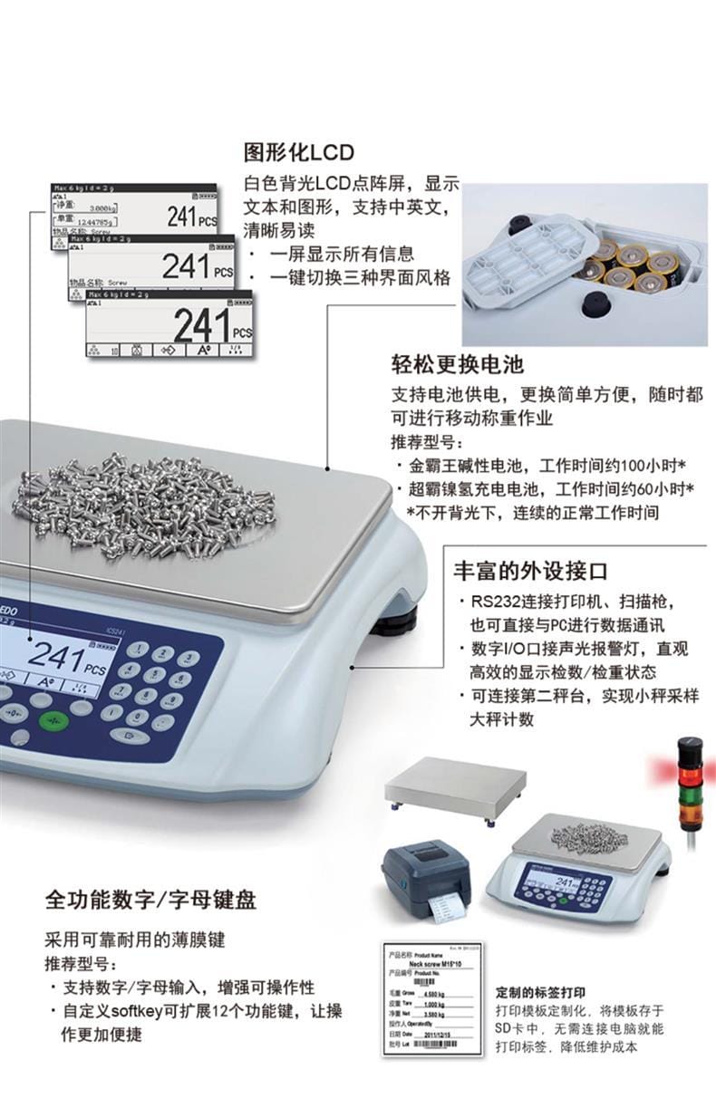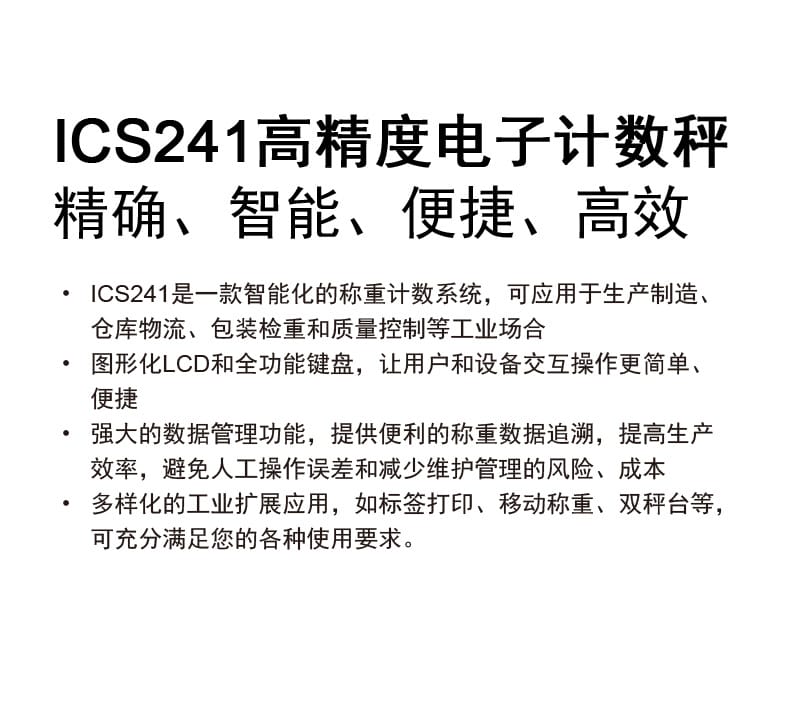 提供3kg、6kg、15kg、30kg多种量程选择,均达到Ⅲ级准确度标准,配备ABS塑料机身与304不锈钢秤盘,适应-10~40℃工业环境。ICS241以稳定性能、丰富接口和灵活应用,助力企业实现高效、精准的称重管理。