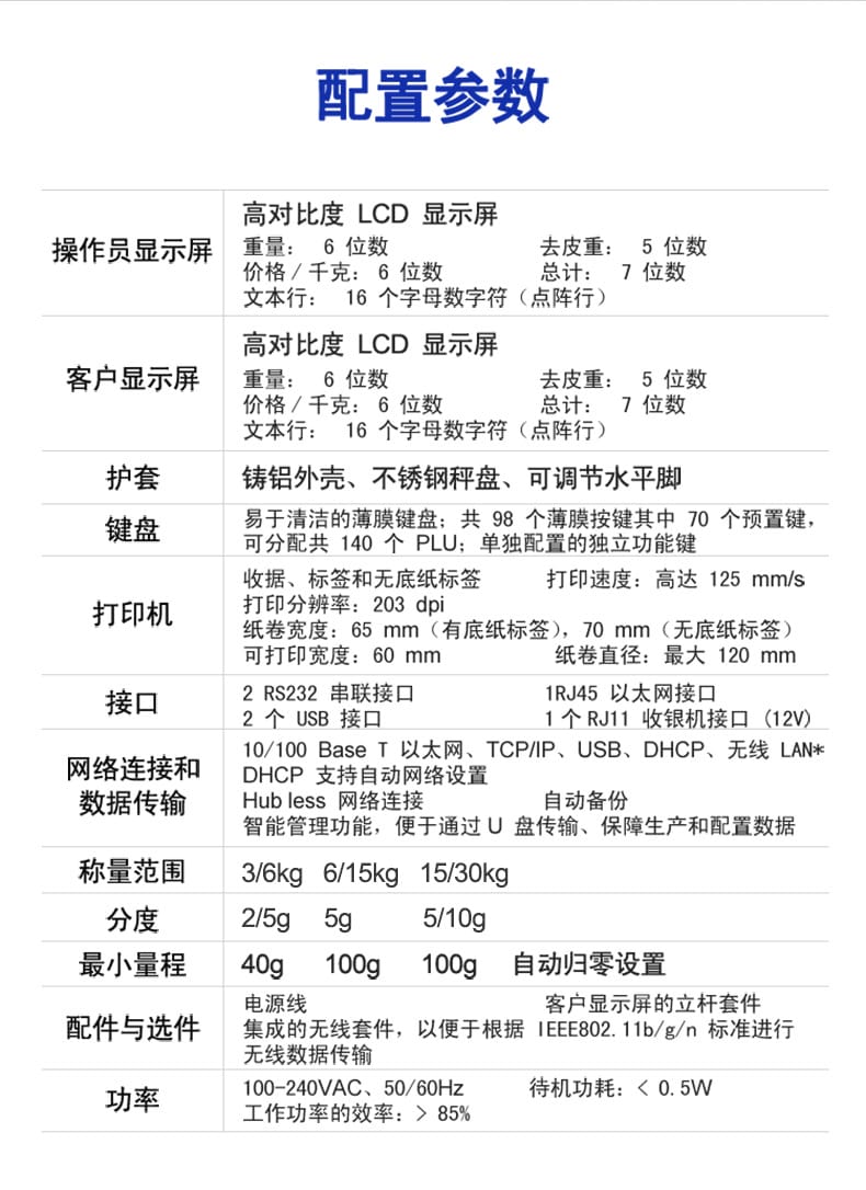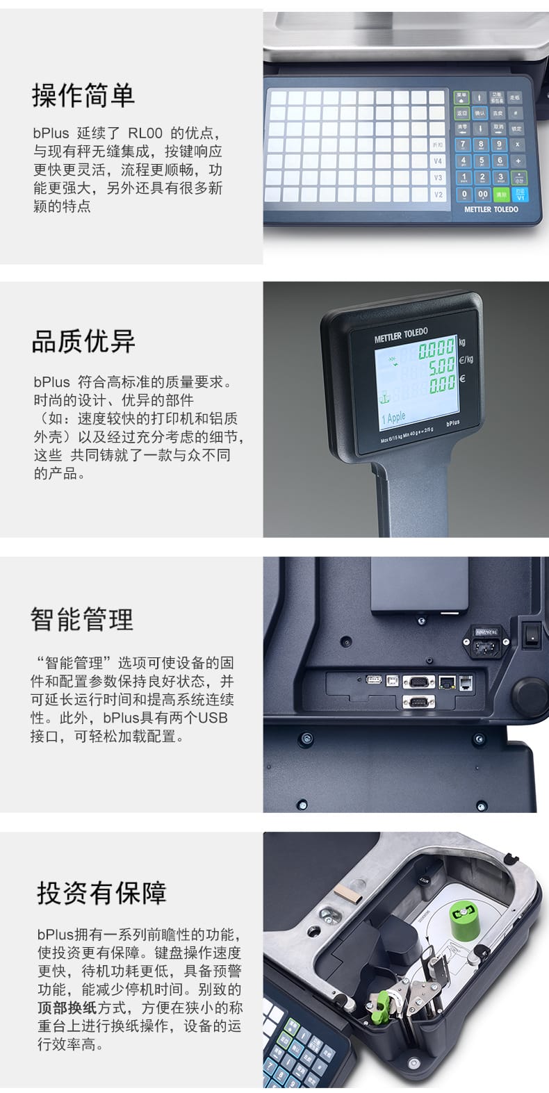 梅特勒托利多bPlus条码秤是一款专为现代零售环境设计的高性能称重设备。延续RL00系列优势,bPlus响应更快、操作更流畅,配备高对比度LCD显示屏,支持重量、价格、总计等多信息清晰显示。采用铸铝外壳与不锈钢秤盘,坚固耐用,符合人体工程学设计,易于清洁,适应高强度使用场景。 设备搭载智能管理系统,支持通过U盘经由双USB接口快速加载配置,实现固件更新与数据备份,提升系统连续性与运行效率。配备高速打印机(最高125mm/s),支持有底纸/无底纸标签打印,顶部换纸设计节省空间,便于在狭小台面操作。 bPlus提供多种称量范围(3/6kg至15/30kg)与分度选择,最小量程可达40g,确保精准称重。标配多种接口(RS232、RJ45、USB、RJ11),支持10/100Base-T以太网、TCP/IP、DHCP及无线LAN(可选),实现灵活组网与数据传输。 适用于大型商超、连锁店、菜市场、便利店等场景,是提升零售称重效率与管理智能化的理想之选。