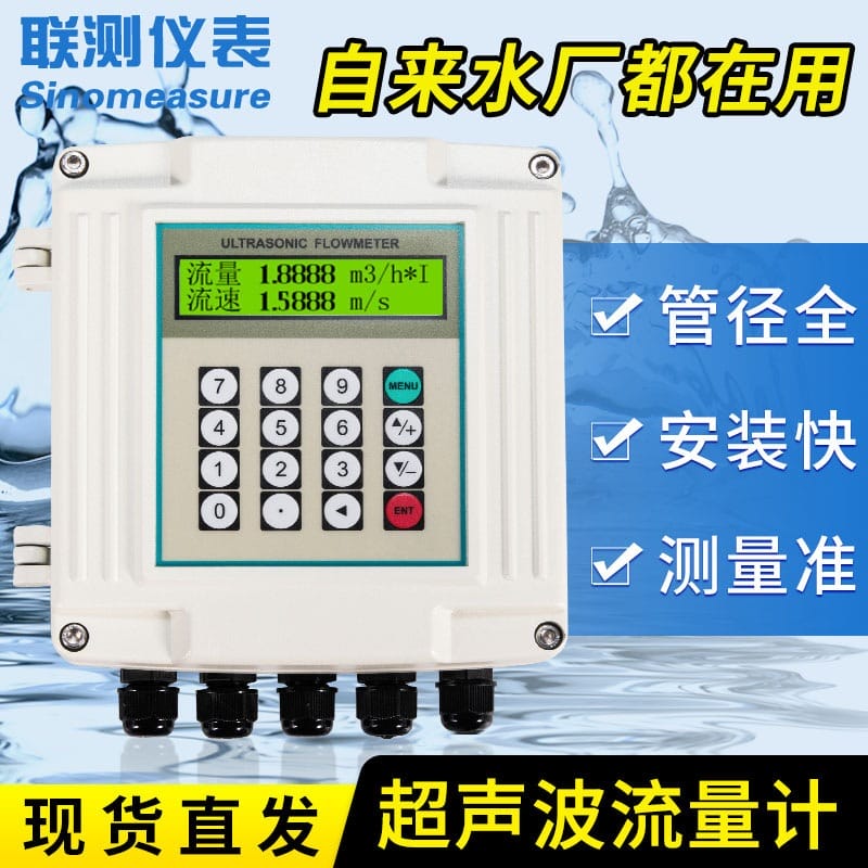 联测自动化(Sinomeasure)生产的超声波流量计是一款高性能非接触式流量测量设备,适用于多种纯净液体的流量监测。产品采用外贴式传感器设计,支持Z法、V法和W法安装方式,适配DN32至700mm管道,测量精度高达±1%,流速范围0.01~5.0m/s。主机配备实时流量与流速同屏显示功能,支持累计流量查询及流量保持操作,内置RS485通讯接口(标准Modbus协议)和4-20mA模拟量输出,便于系统集成。设备具备IP65防护等级,工作温度范围宽,适用于复杂工业环境。配套提供专用超声波耦合剂、可调节管道抱箍及安装指导服务,确保现场安装便捷准确。联测在全国设有20余个服务网点,提供上门调试、培训与技术支持,已广泛服务于娃哈哈、五粮液、华为、比亚迪等行业龙头企业,品质可靠,值得信赖。