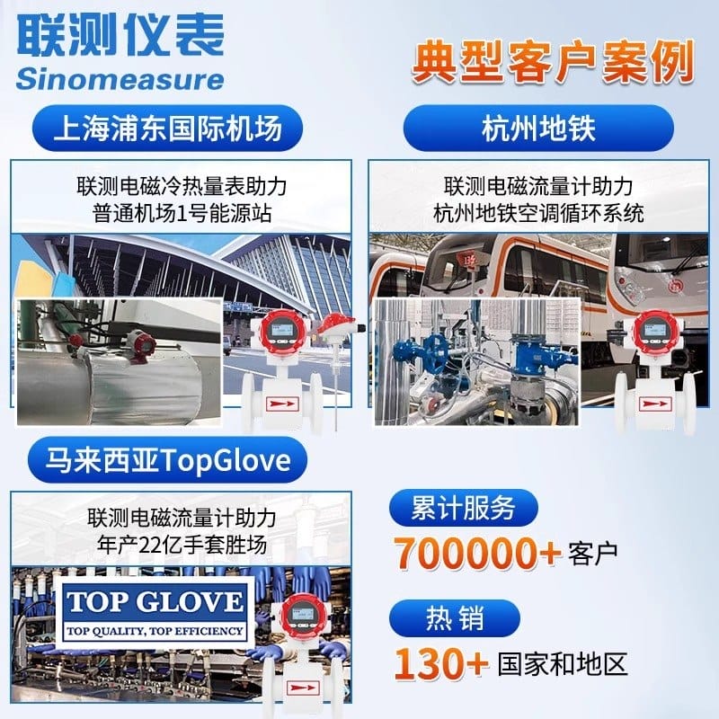 联测仪表(Sinomeasure)专业提供全套流量计量仪器仪表,产品包括电磁流量计、超声波流量计、涡街流量计、涡轮流量计、金属管浮子流量计和多普勒流量计,覆盖DN25~DN2000多种口径定制需求。针对不同介质与工况提供精准选型方案:水/污水推荐电磁流量计;纯水/循环水/油类选用超声波流量计,无需破管,安装便捷;压缩空气/蒸汽/导热油适用耐高温、强抗震的涡街流量计;纯净液体如柴油、水等可选轻巧经济的涡轮流量计;小流量气液介质推荐金属管浮子流量计,读数直观、控制精准;溪流、河道、排污口等复杂环境则适配超声波或多普勒流量计。拥有全自动标定线,最大支持DN1000大口径标定。已服务超70万家客户,应用于污水处理、能耗监控、定量配料、加药控制等多个领域,如淮南矿业、浙江恒昌纺织、杭州市环境集团等。全国设立30余个办事处,支持工程师上门服务,配备24小时技术支持。公司通过ISO9001、CE、SGS验厂及中国计量器具型式批准认证,拥有45000㎡现代化生产基地,欢迎咨询与验厂。