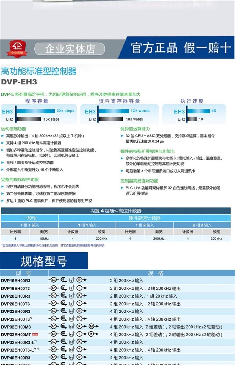DVP-EH3系列是DVP-E系列中的高阶型号,专为应对复杂的工业自动化应用而设计。该系列控制器具备更大的程序容量和数据寄存器,支持32位CPU+ASIC双处理器架构,实现最快0.24微秒的基本指令执行速度,并支持浮点运算,显著提升运算性能。 DVP-EH3系列配备4轴200kHz高速脉冲输出(适用于32点以上T机型),内置4组200kHz硬件高速计数器,支持多种计数模式(1相1输入、1相2输入、2相2输入),满足高精度定位与运动控制需求,广泛应用于贴标机、包装机、印刷机械等领域。 本系列支持直线/圆弧插补、外部16级中断、最多3个串行通讯端口或以太网卡扩展,具备PLC Link功能,可构建最多32台设备的联网系统。同时提供多重密码保护、程序自动备份、第二份程序存储等功能,确保程序安全不丢失。 产品型号包括DVP16EH至DVP80EH系列,支持输入/输出差动信号,兼容多种扩展模块,如模拟量I/O、温度测量、运动控制等,全面提升系统灵活性与可靠性。官方正品保障,假一赔十,支持开具13%增值税专用发票,工厂直销,品质保证。