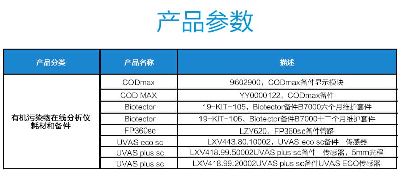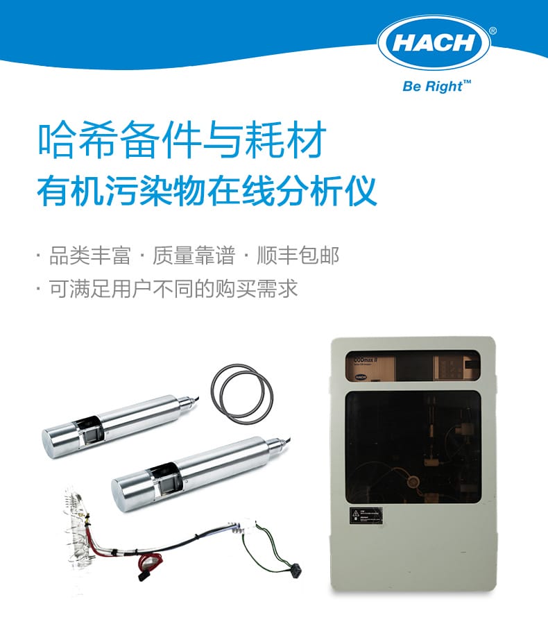 哈希(Hach)有机污染物在线分析仪耗材与备件专区,提供全系列原厂正品支持。产品包括:9602900 CODmax显示模块、YY0000122 COD MAX通用备件、19-KIT-105和19-KIT-106 Biotector B7000六个月及十二个月维护套件、LZY620 FP360sc管路、LXV443.80.10002 UVAS eco sc传感器、LXV418.99.50002(5mm光程)及LXV418.99.20002 UVAS plus sc传感器等。品类丰富,适配哈希全系列仪器,厂家直供,质量可靠。支持7天无理由退换,顺丰包邮快速配送。发票在确认收货后10个工作日内开具并寄出,请知悉时效后再下单。哈希,世界水质守护者,让您的水质分析更精准、更安心。