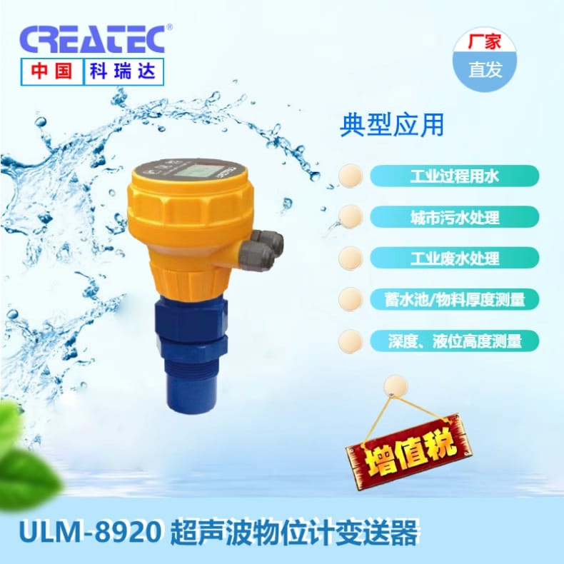 科瑞达(CREATEC)ULM-8920超声波物位计变送器是一款专用于工业液位和料位测量的高性能仪表。适用于工业过程用水、城市污水处理、工业废水处理、蓄水池及物料厚度测量等场景。安装时,若被测液面平静,应垂直于被测面安装;当液面波浪较大时,建议使用波导管以提高测量稳定性。在进行料位测量时,也需垂直安装于物料表面,并避开搅拌器和进料口,以确保测量精度和设备运行可靠性。